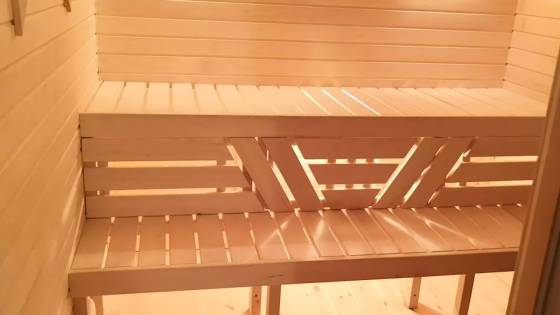 Что здесь представляет интерес и что я хотел показать: входная дверь здесь — качественно сделанный пластиковый стеклопакет, покрашенный с двух сторон. Снаружи в цвет бани под орех, изнутри под цвет дерева бежево-жёлтым.