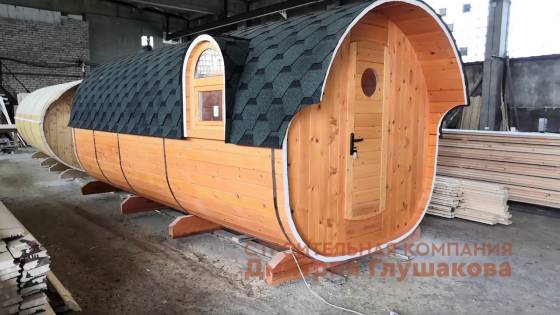 Эта баня отличается от стандартных «Пятачков» арочным боковым окном. Оно украшает баню и делает ее неповторимой.