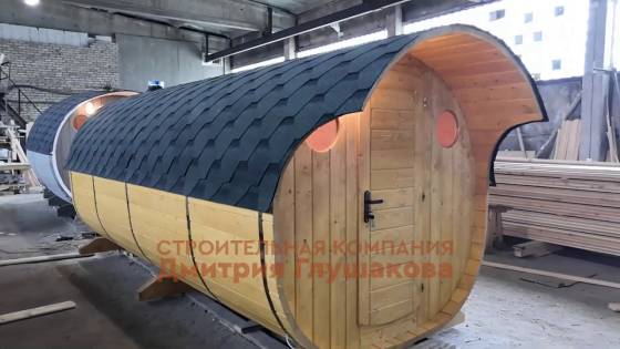 Красивый вариант бани-бочки «Пятачок» с двумя комнатами: полностью оборудованная сауна и большая раздевалка (она же комната отдыха). В парной сделаны два дополнительных окошка.