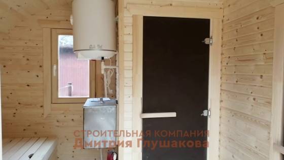 Это немного модернизированный проект бани «Танк». В отличии от обычного проекта тут поставлена душевая система и дверь в душ.