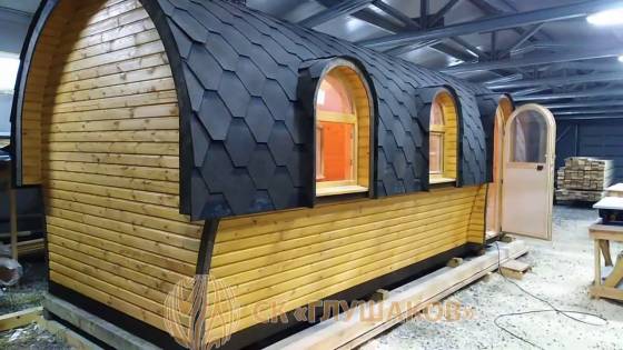 Пример бани «Сундучок» с нестандартной планировкой — такую же Вы можете заказать и для Вашего проекта. Отличие этой бани от привычной планировки в том, что вход сделан не по центру, а сбоку. Также сделана большая помывочная. Душ проектом не предусмотрен.