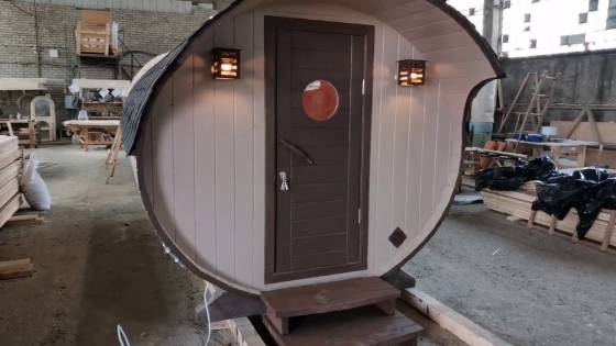 Снаружи сделаны светильники — вечером смотрятся просто восхитительно! Снаружи баня покрашена Тиккурилой (краска очень стойкая). Входная дверь нашего производства, что гарантирует хорошее качество. Закрывается на замок.