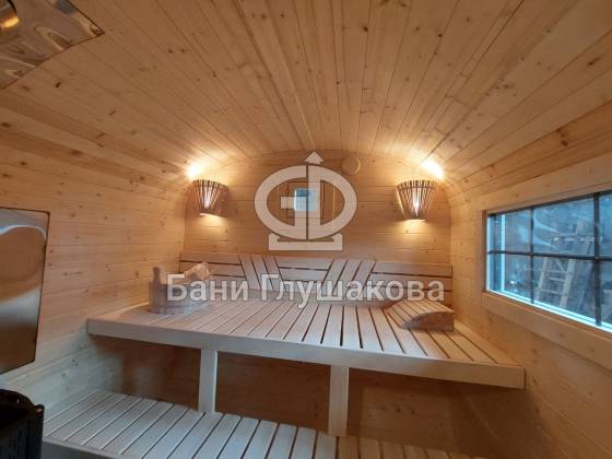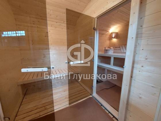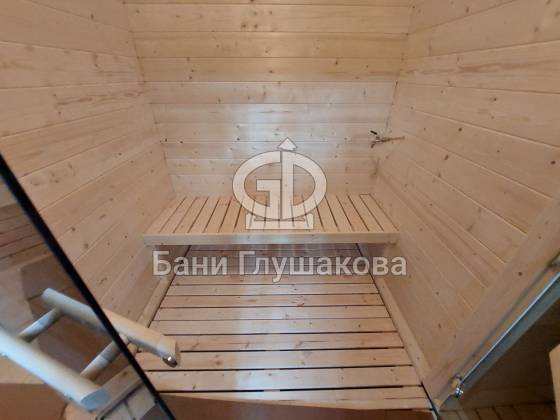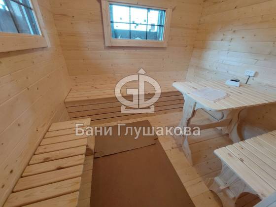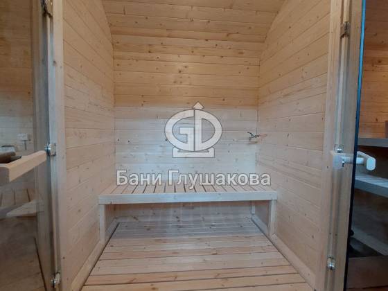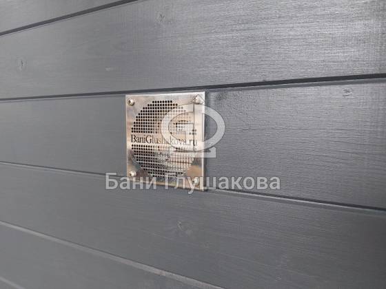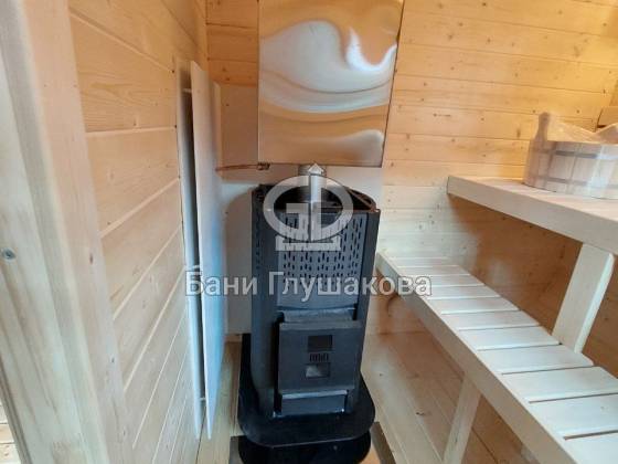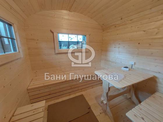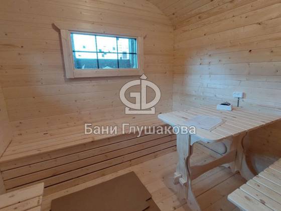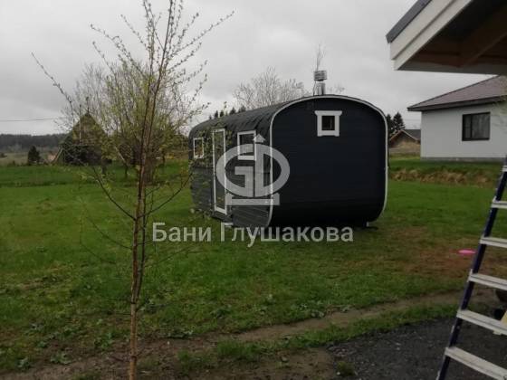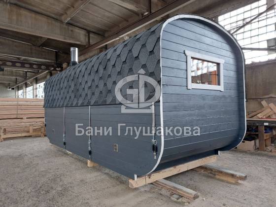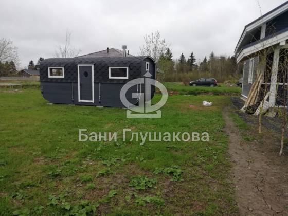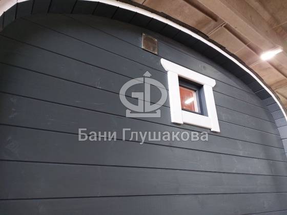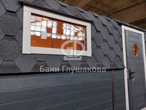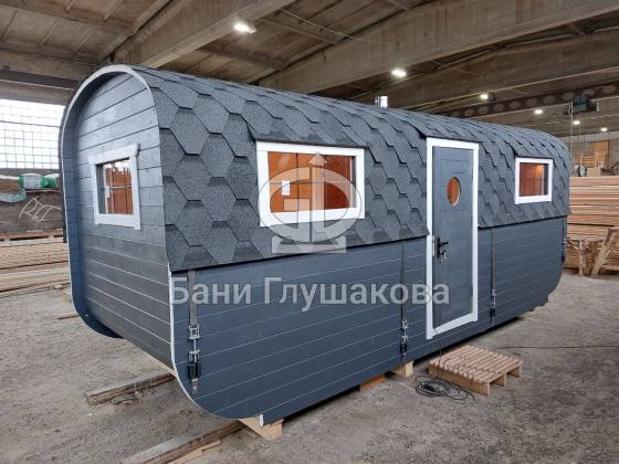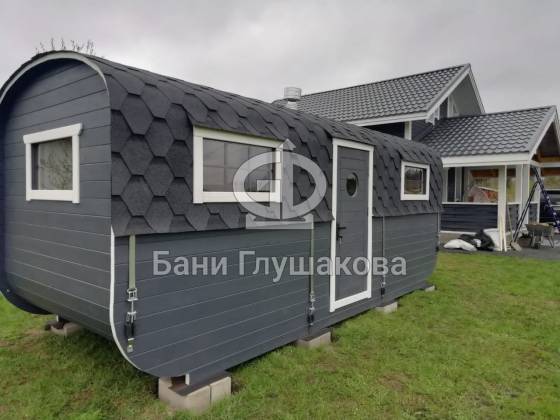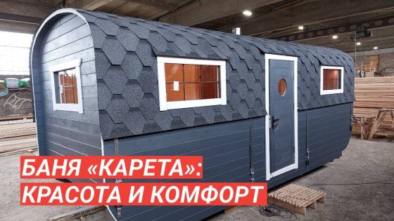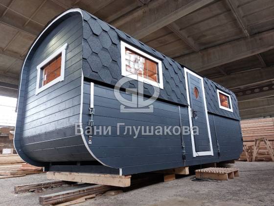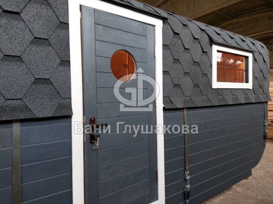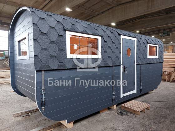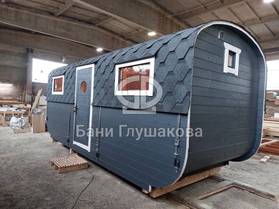 Баня «Карета» в восхитительном синем цвете с серой крышей в тон и контрастной белой обводкой.
