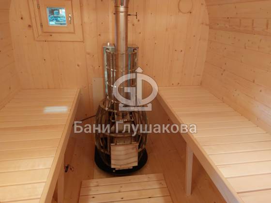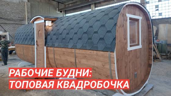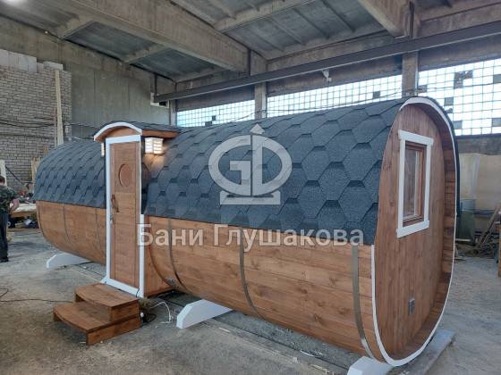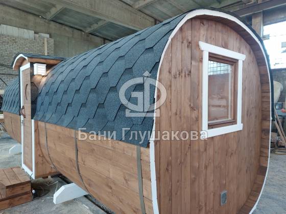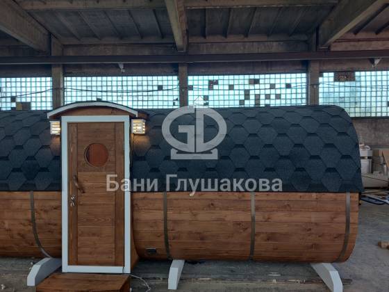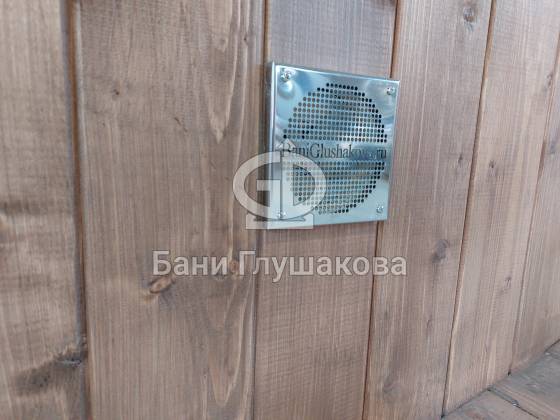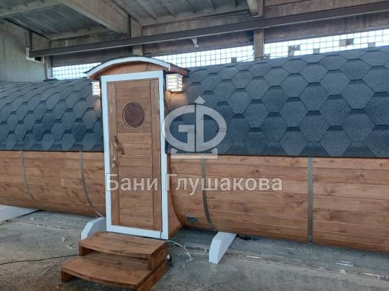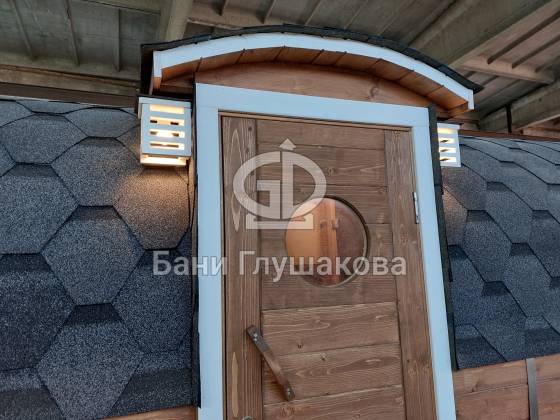 Одно из лучших решений для дачной бани: квадробочка с входом посередине. Размер 2,2х5,9 метров. Впервые поставили у входа светильники — неплохо смотрятся. Цвет «Орех» Акватекс.