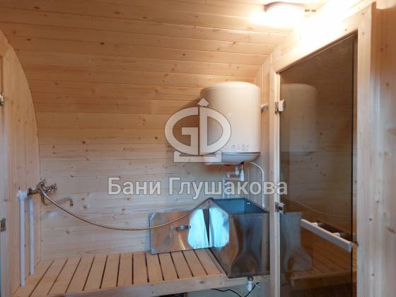 В бане установлено душевое оборудование. Что ни говори, а это очень удобно. Кстати, водопровод при этом не обязателен, можно обойтись и без него, но придётся наливать воду в систему вручную.