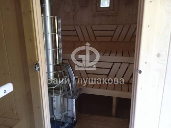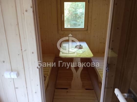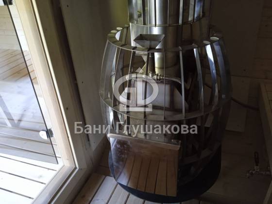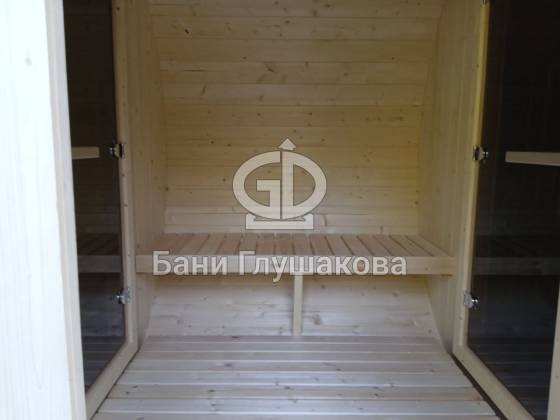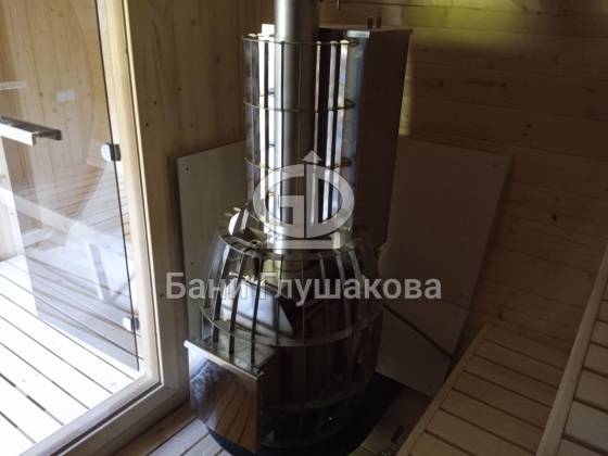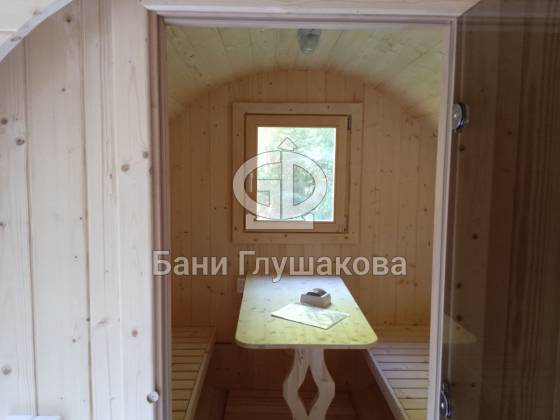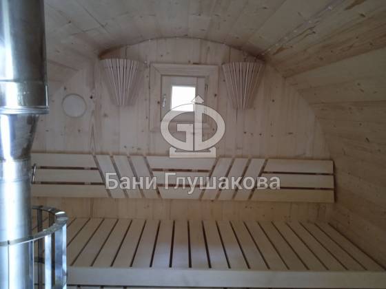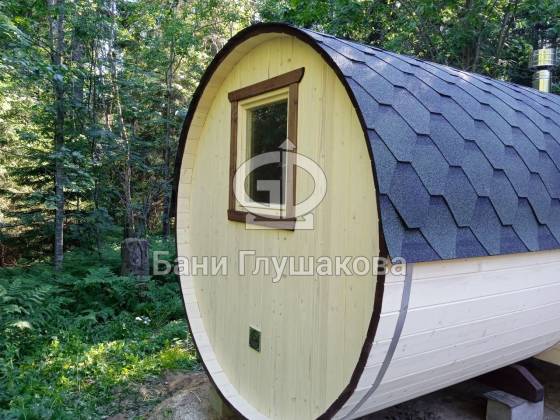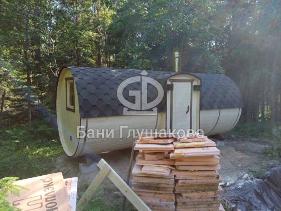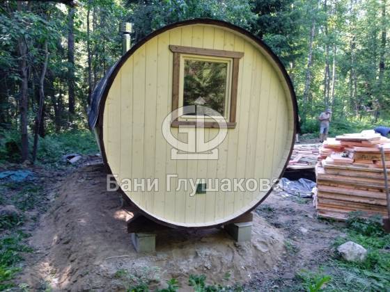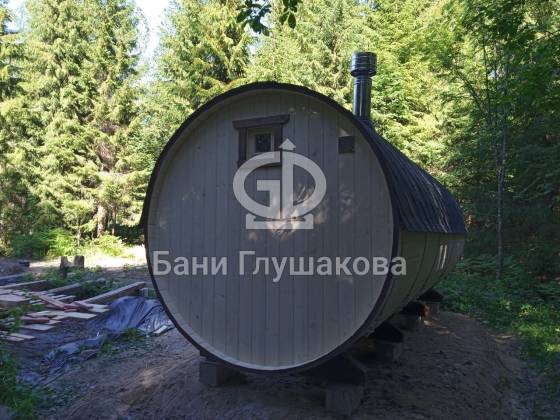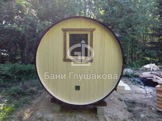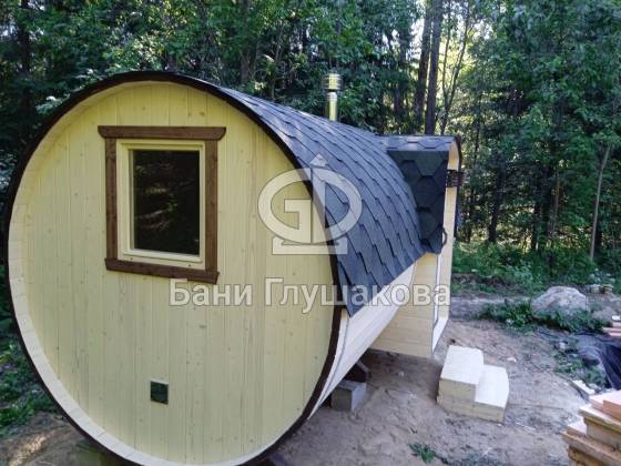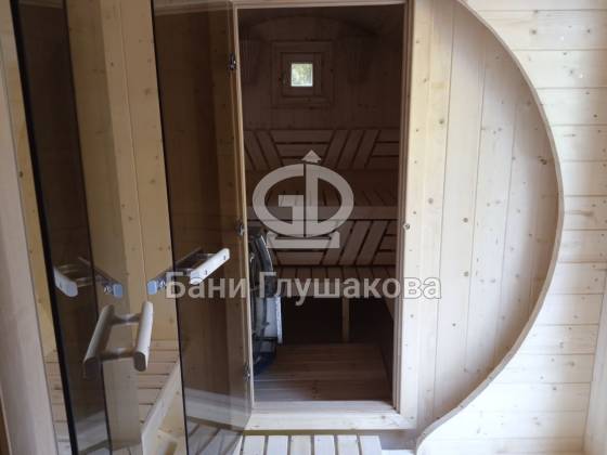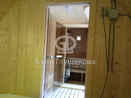 Собрали красивую большую баню-бочку круглой формы с необычным оформлением входа. Дверь расположена по центру и ведёт в предбанник. Парная и комната отдыха находятся по разные стороны от входа.