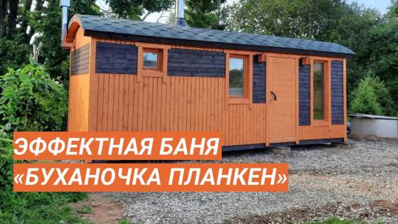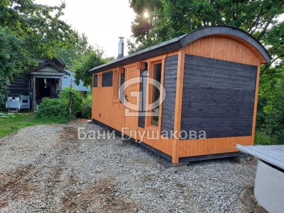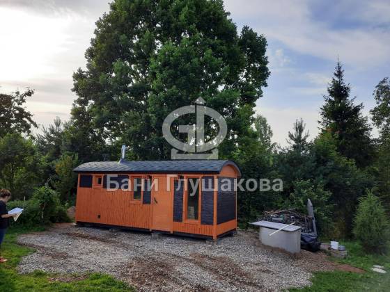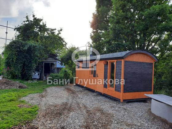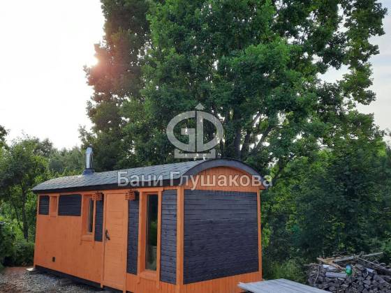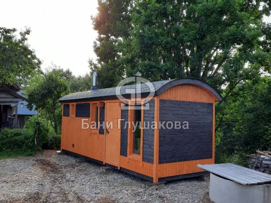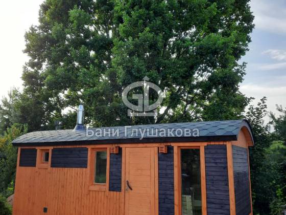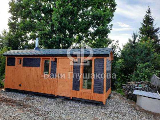 Редкая перевозная баня с отделкой технологичным и долговечным материалом — планкеном. Впервые покрасили в такие яркие весёлые цвет — Акватекс «Орегон» и «Венге». Смотрится, конечно, эффектно!