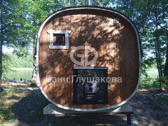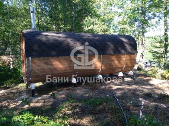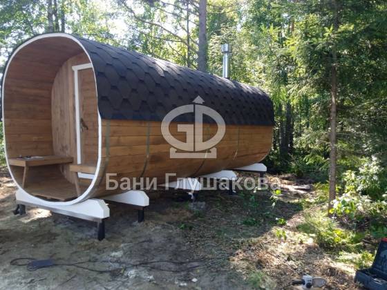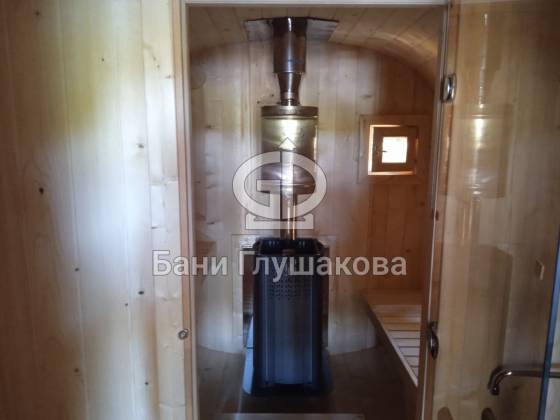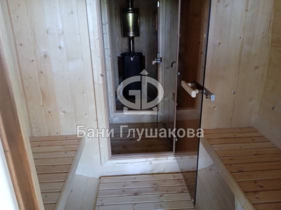 Квадробочка, в которой есть где развернуться! Нестандартная баня увеличенного размера 2,3 на 5,8 метров из ёлки. На входе сделана терраса.
