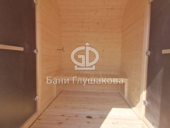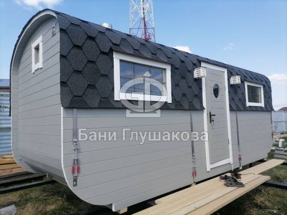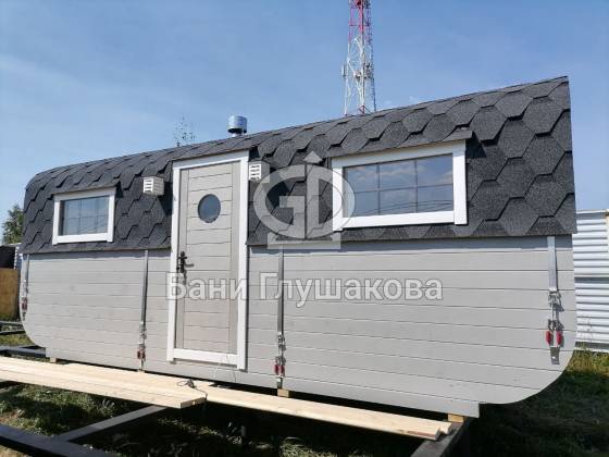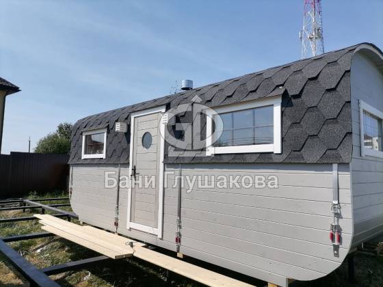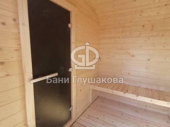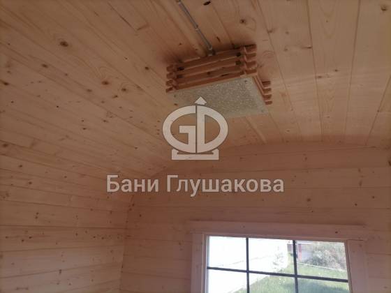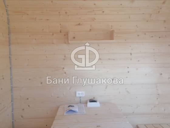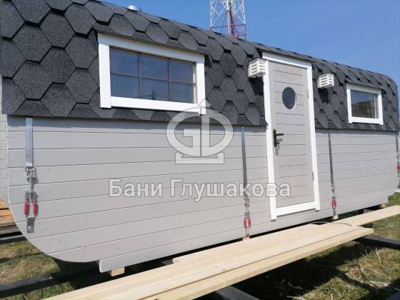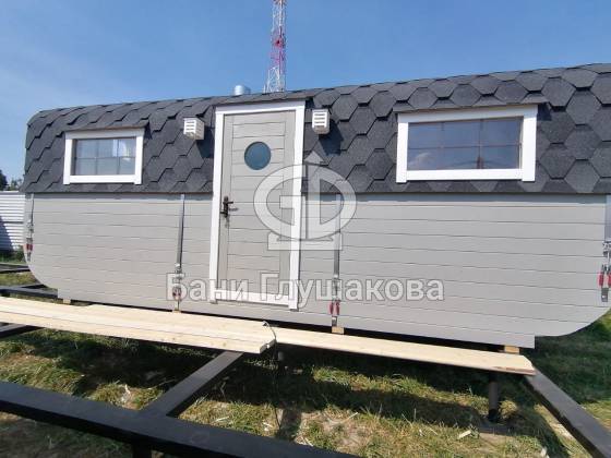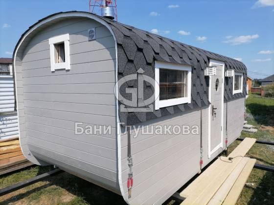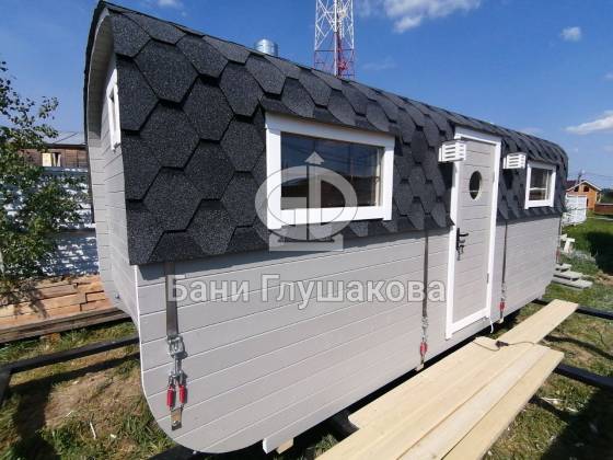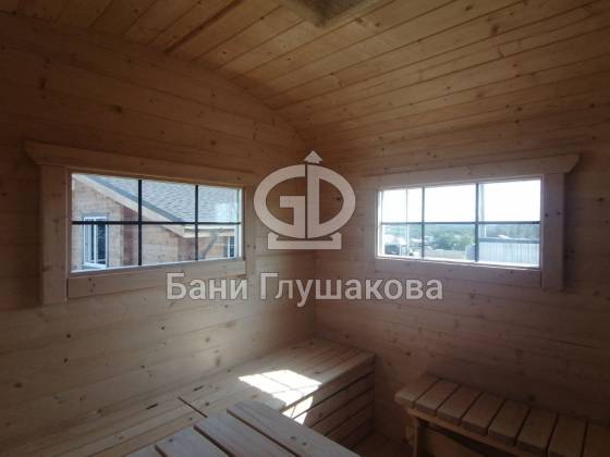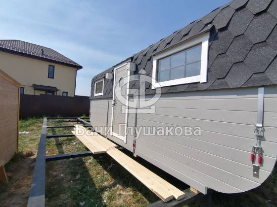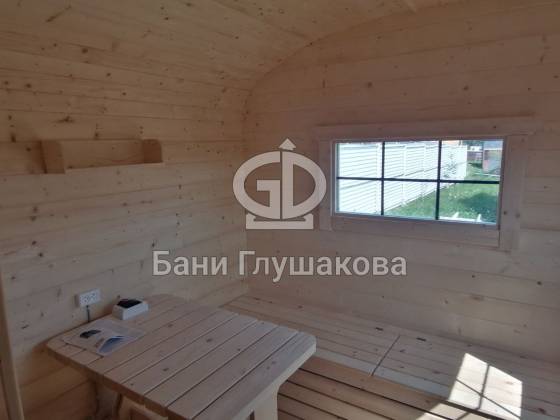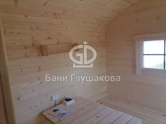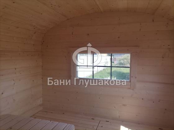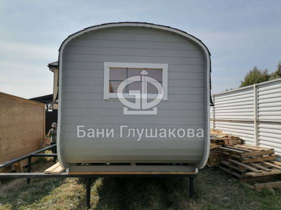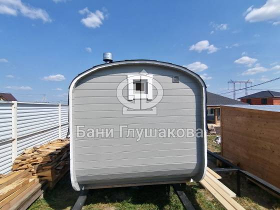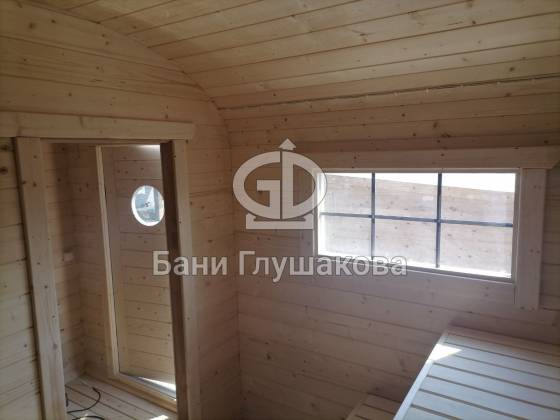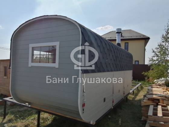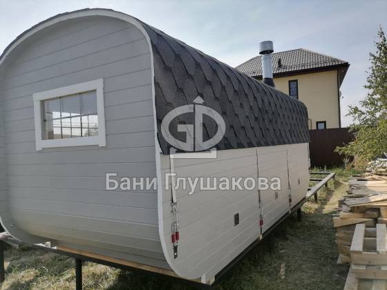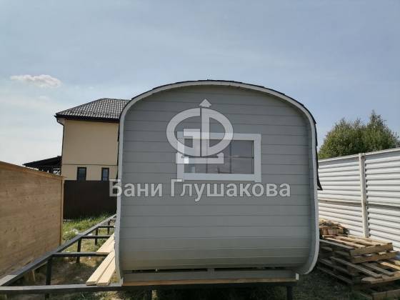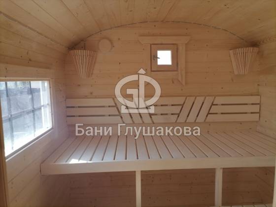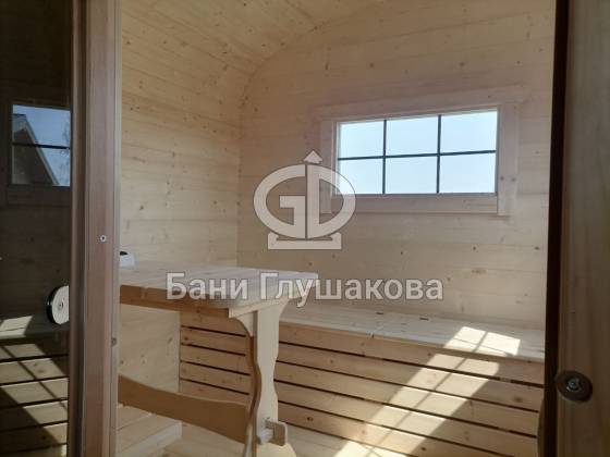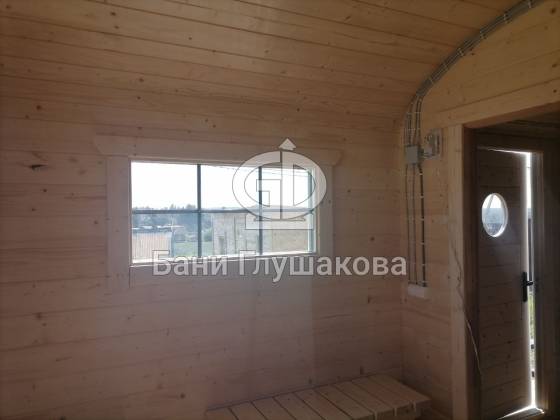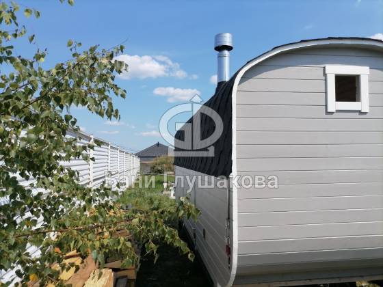 Очень удачной получилась эта банька «Карета». Изготовлена из бочковой кедровой доски. Собиралась в цеху — на участок банька привезена уже в готовом виде.