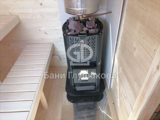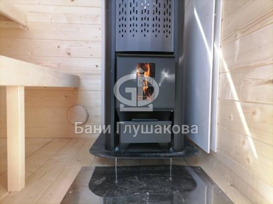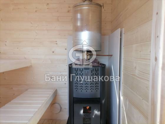 Отличная комплектация: печь Костёр Рейн 16 с укороченной топкой, широченные двухуровневые полки, бронзовые матовые двери из жаропрочного стекла, люстра «Квадро», добротная мебель в комнате отдыха.