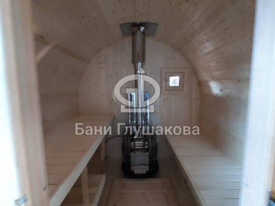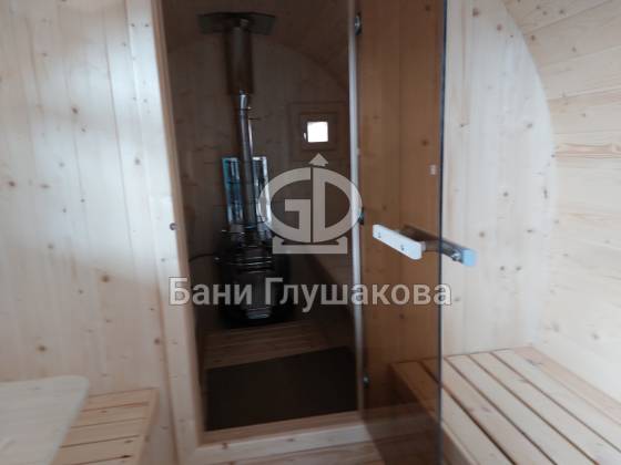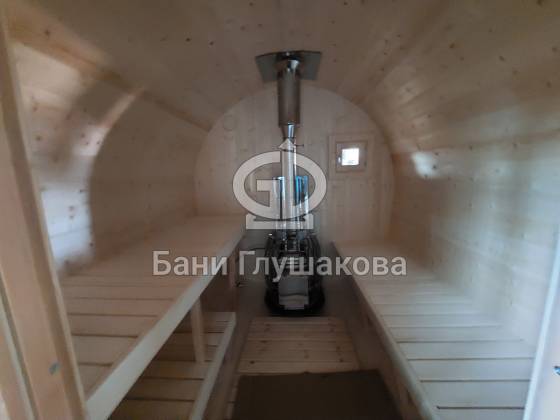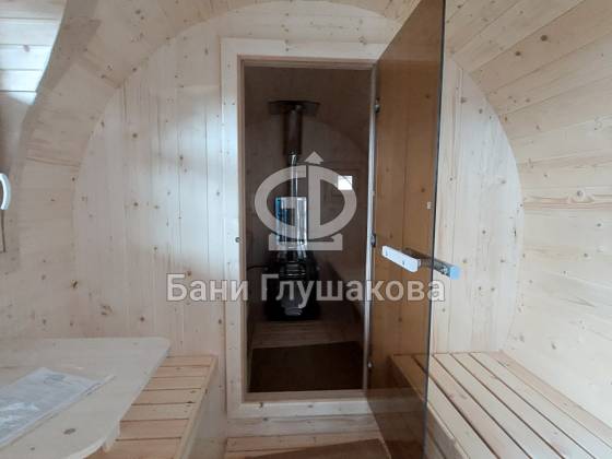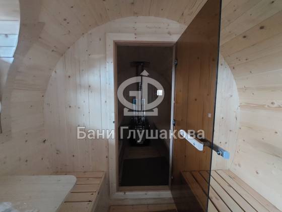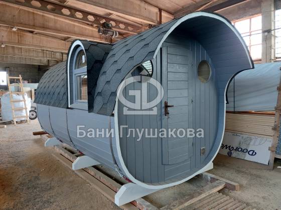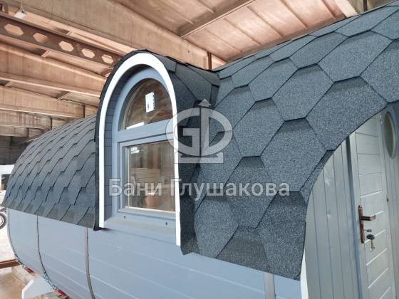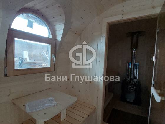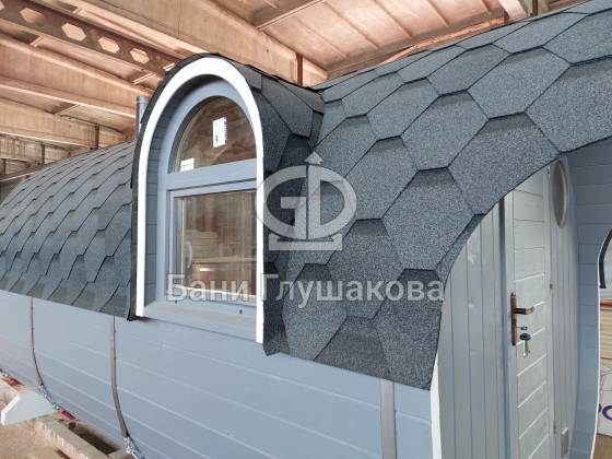 Размер 2,3 на 4 метра с козырьком. Сбоку красивое арочное окошко — главная изюминка этой бани. Входная дверь «Корабельная» с округлыми краями подчёркивает форму баньки.