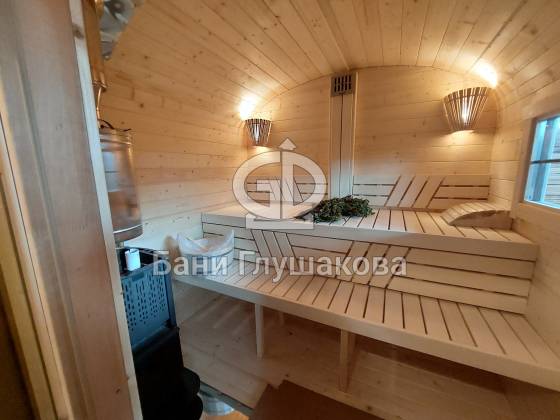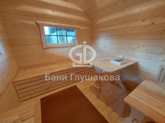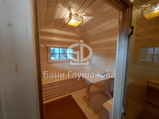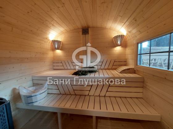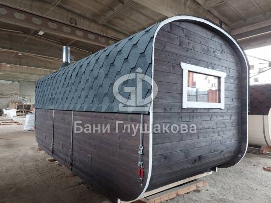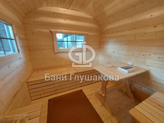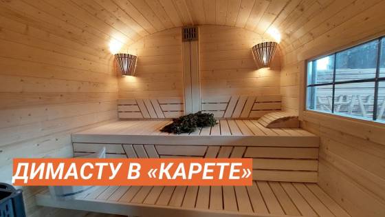 Баня изготавливается по принципу бани-бочки из бочковой доски и имеет металлические стяжки. «Каретой» назвали из-за внешнего вида — округлости и симметрично расположенные окна напоминают о средневековых королевских каретах.