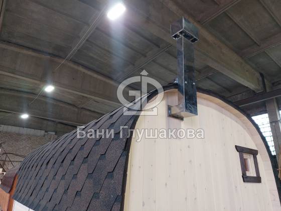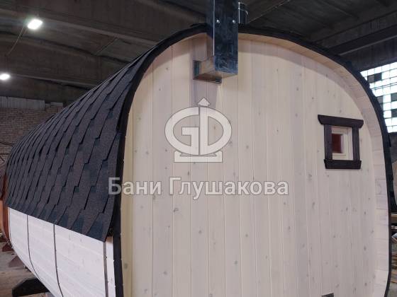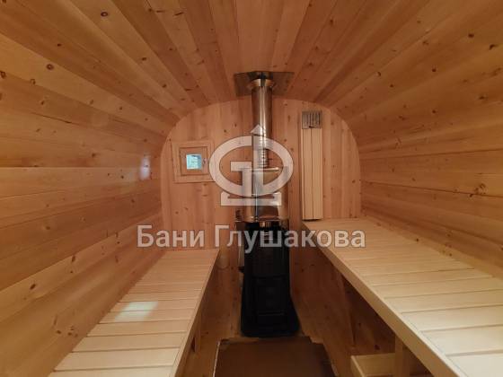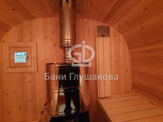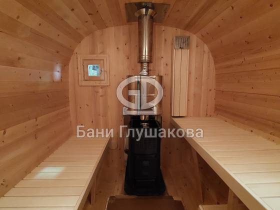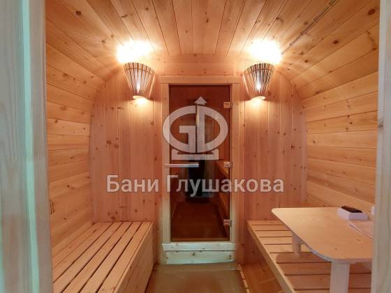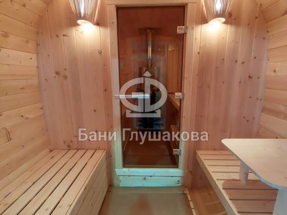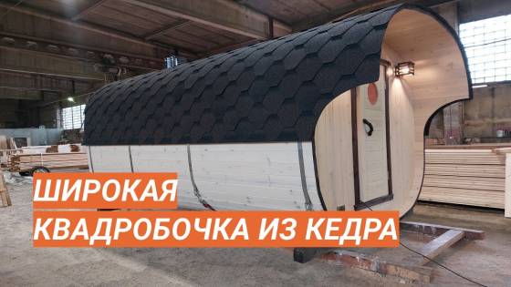 На обзоре кедровая квадробочка 2,4 на 4 метра — широкая, внутри просторно. Внутри 2 помещения: предбанник и парная.