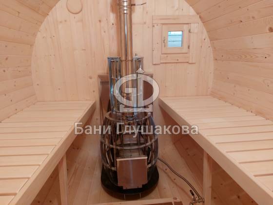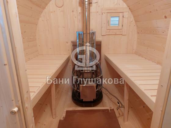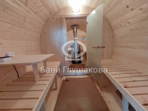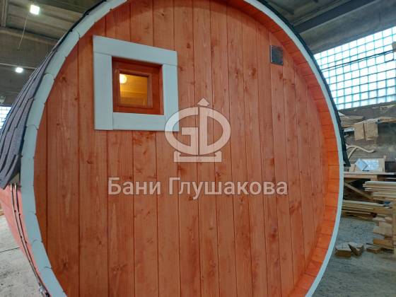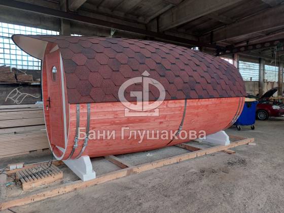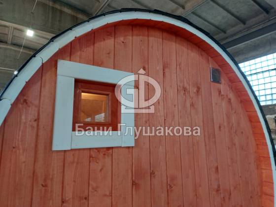 Вот рад показать вам выпуклую баню-бочку по проекту «Ступино». Изготовлена из ёлки, 4 метра, 2 отделения.