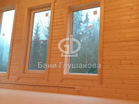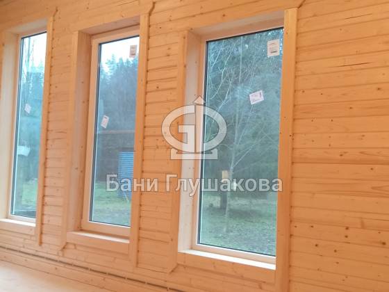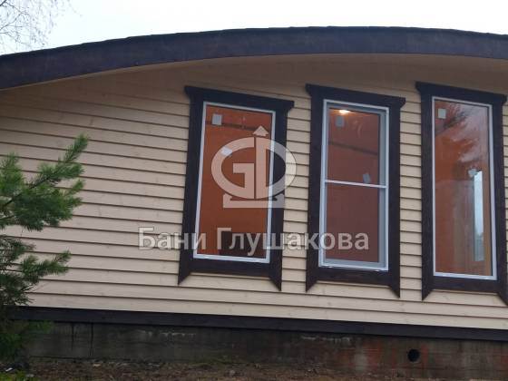 В остальном строительство прошло хорошо. Баня в нашем фирменном узнаваемом стиле: покатая крыша, галерея высоких окон, наружная отделка доской внахлёст.