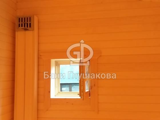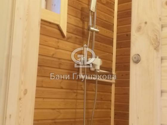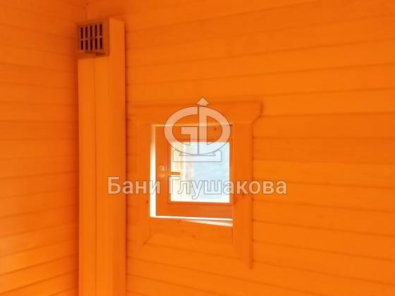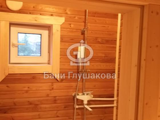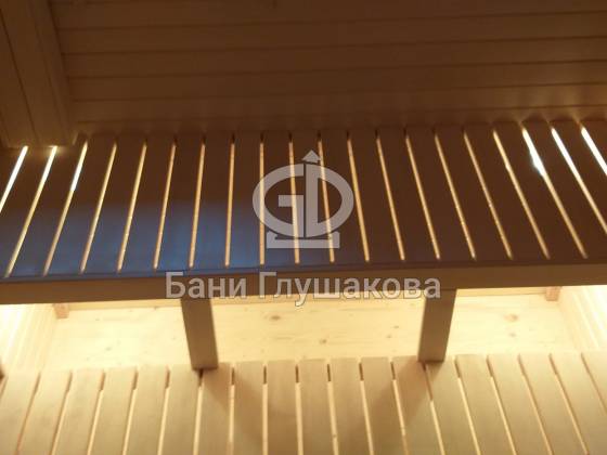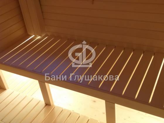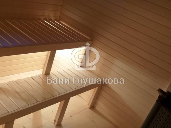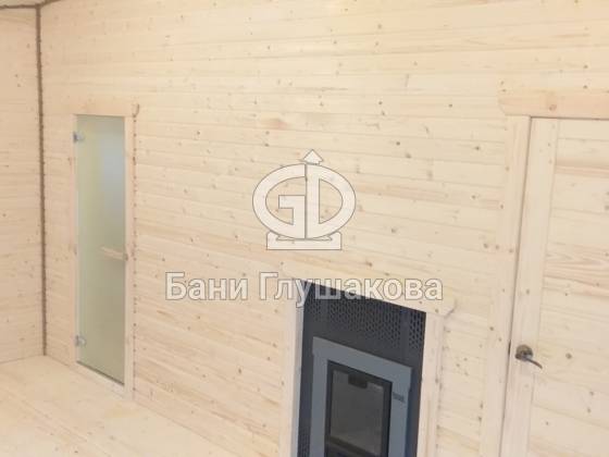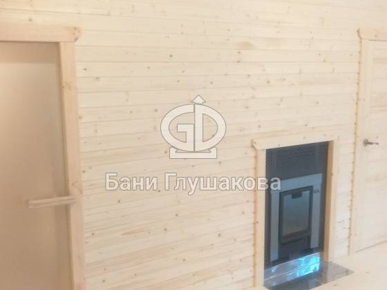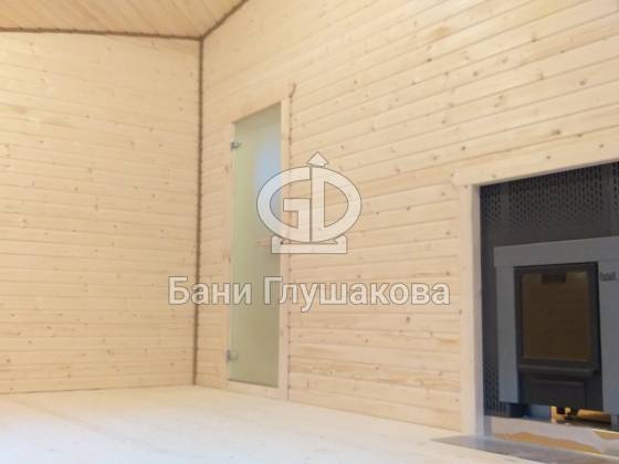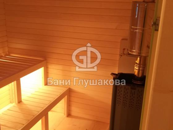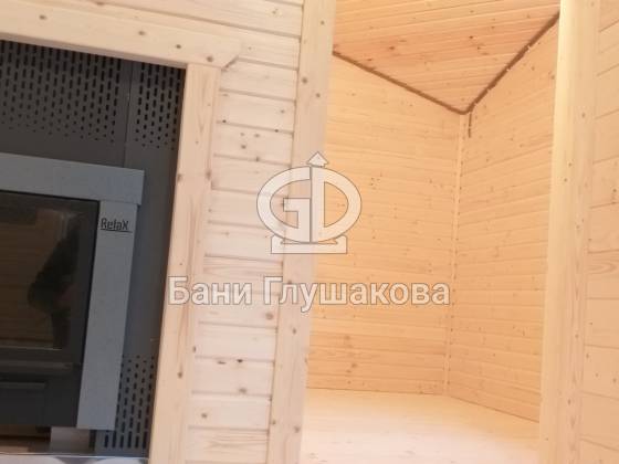 Перед входом установлен подиум, на котором позже будет сделана зона отдыха. Внутри всё так же сделано под ключ: парная с широкими полками, печью с выносной топкой, вентиляцией «Димасту». В комнате отдыха получилось светло и просторно — тут будет небольшая кухня, мягкий уголок со столом. Также внутри есть небольшая спальня, душевое помещение и санузел.