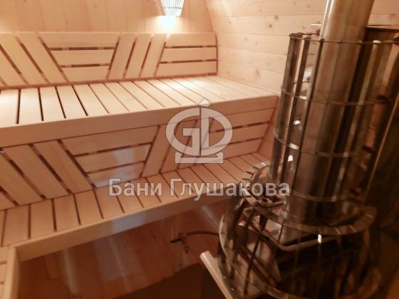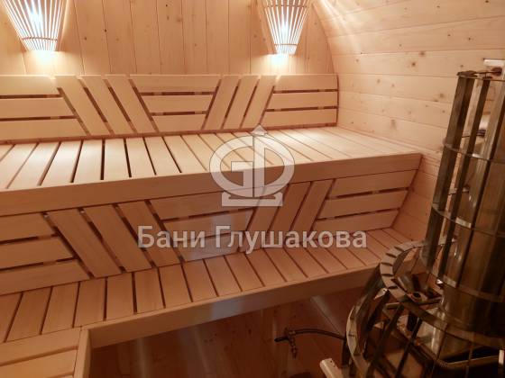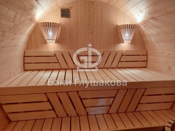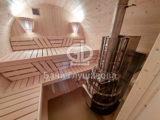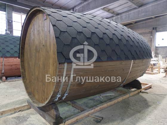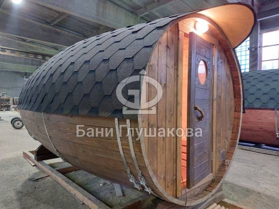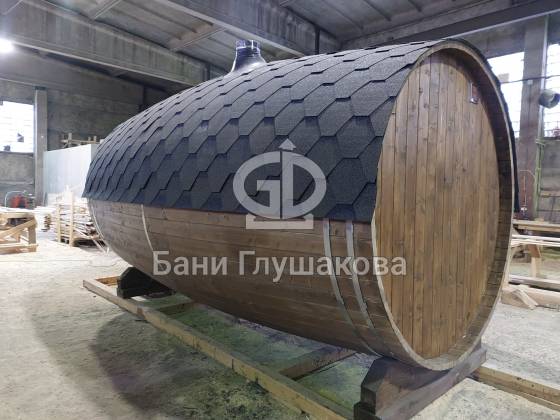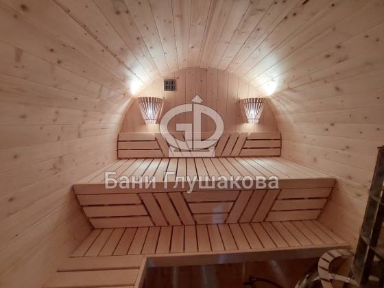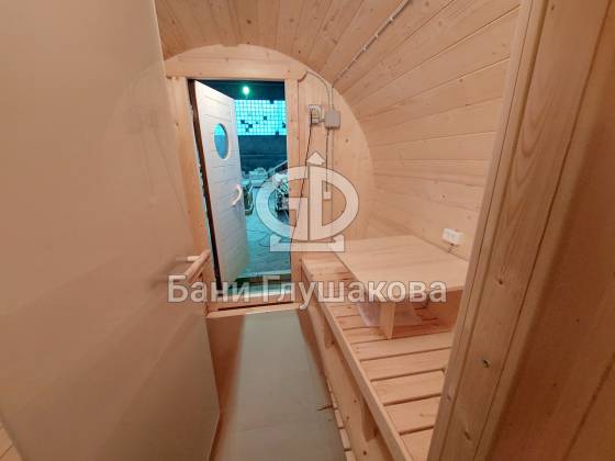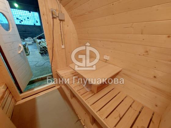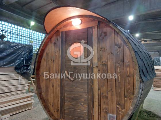 Баня, которая максимально похожа на винную бочку. Видио, к сожалению, не передаёт всю её объёмность. Размер 2,4 на 4 метра, ёлка.