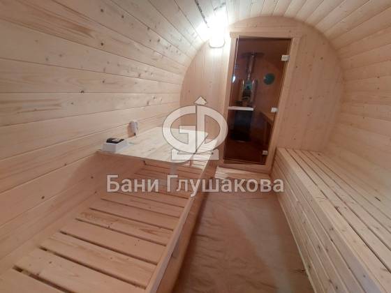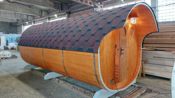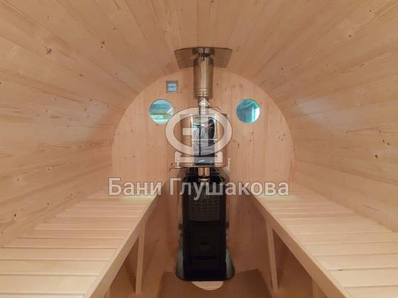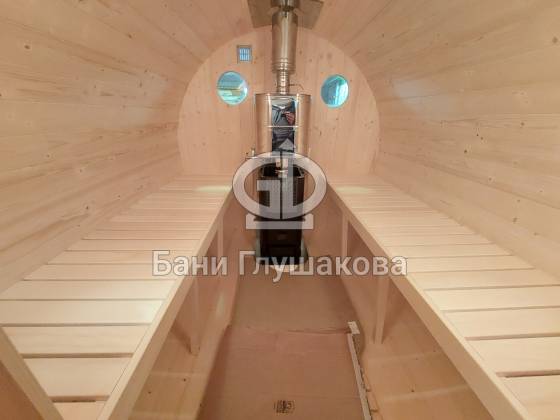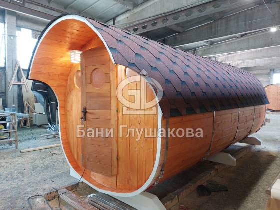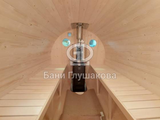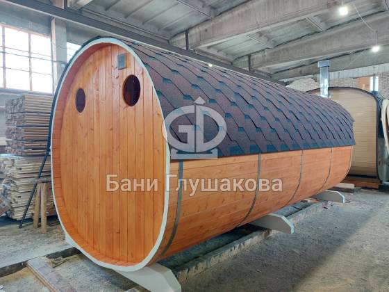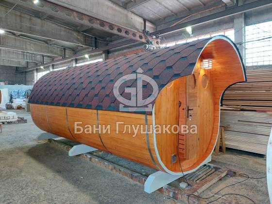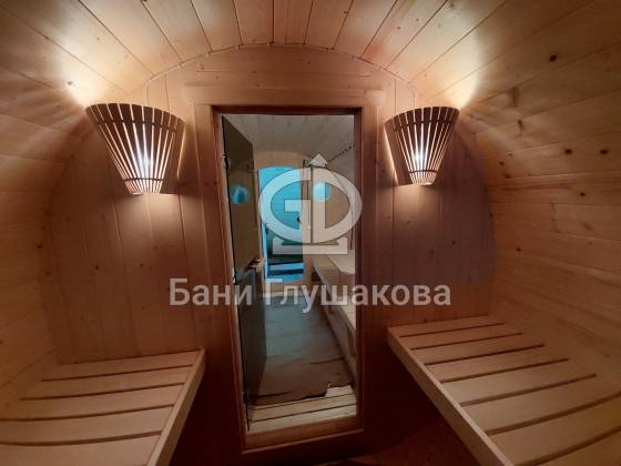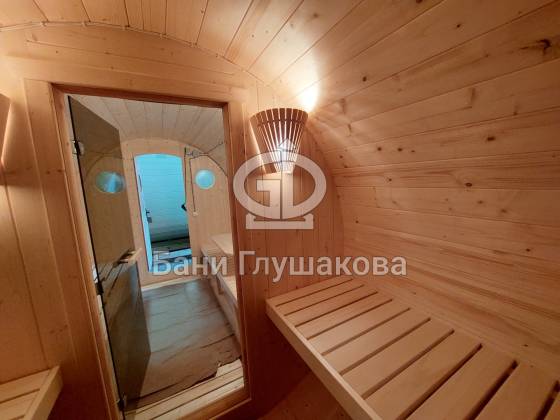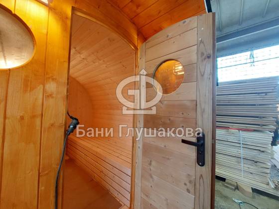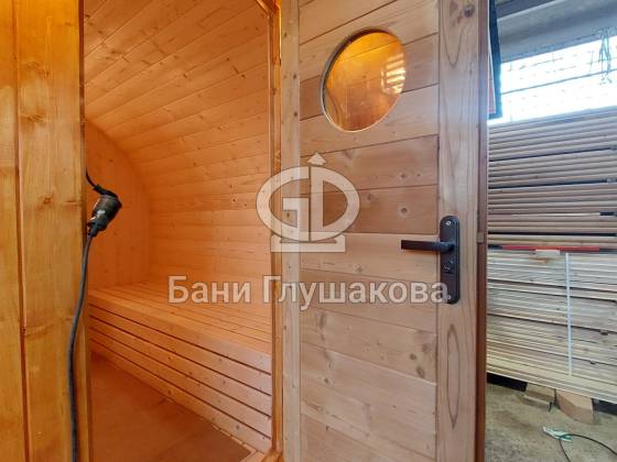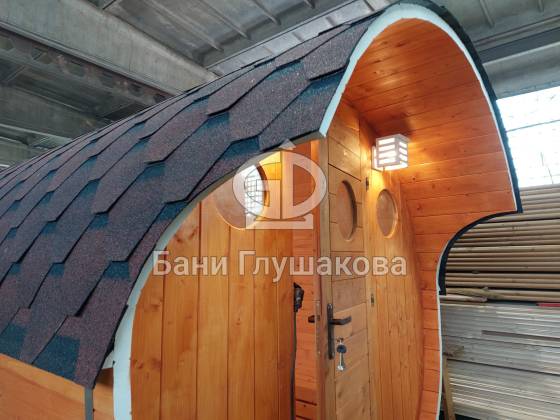 Узнаваемая оригинальная форма дополнена круглыми окошками спереди и сзади. Кажется, мелочь, но благодаря им банька приобретает такой задорный вид. Ну и цвет краски подошёл как нельзя кстати. Это Сенеж Аквадекор «Орегон» — сочный и согревающе солнченый.