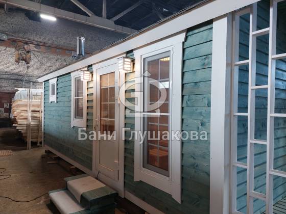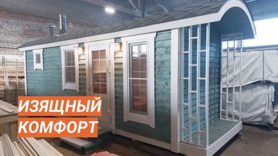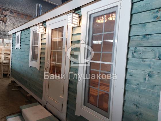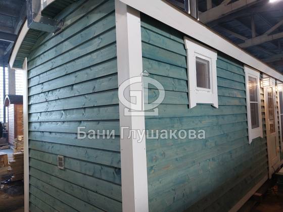 Банька каркасная из доски внахлёст. Покрашена Акватексом оттенка «Лагуна», который буквально заиграл в обрамлении белого кружева обводки.