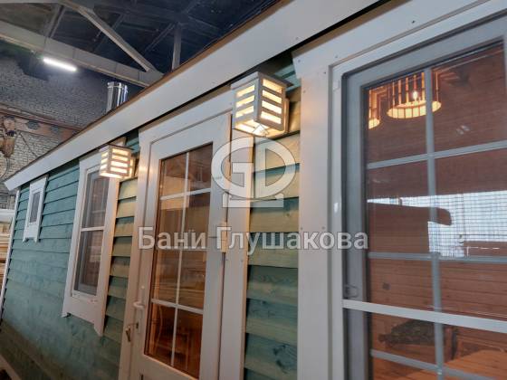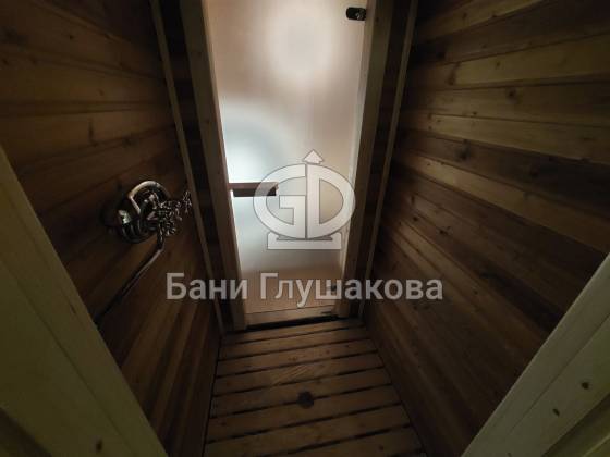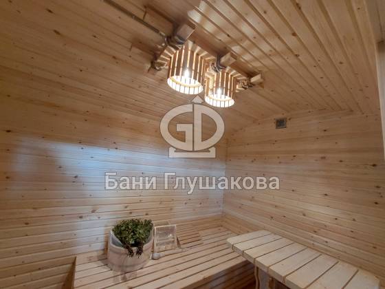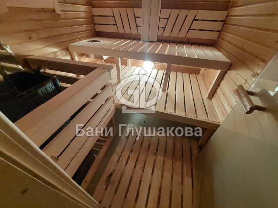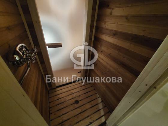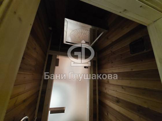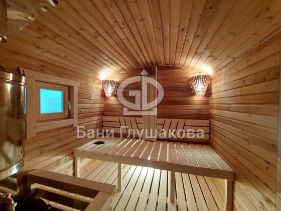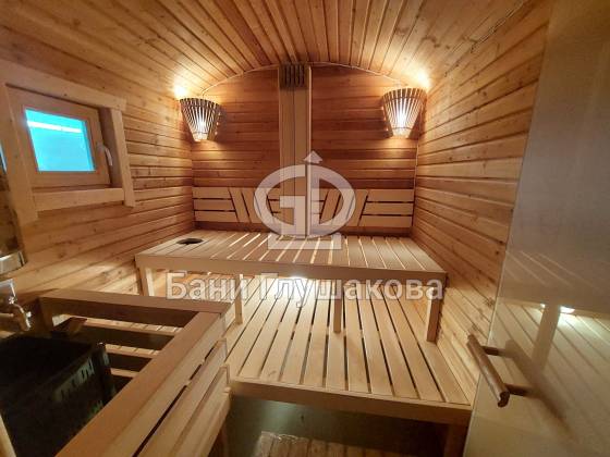 Внутрянка образцово-показательная. Тут и отделка мокрых помещений термодоской, и обливное устройство «Обливасту» в новом дизайне «Капли», и широкая скамья-кровать.