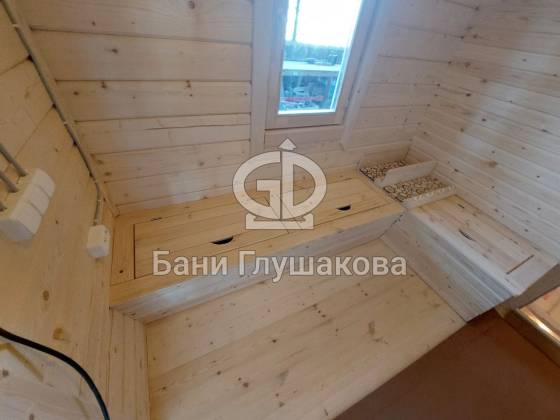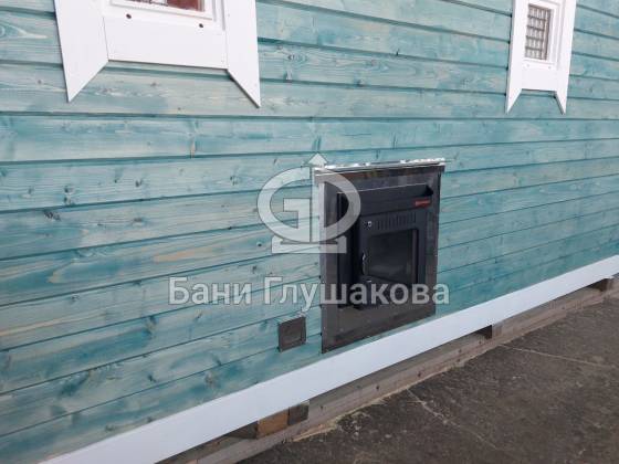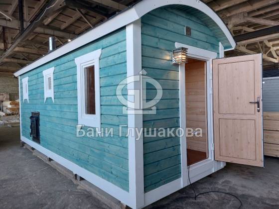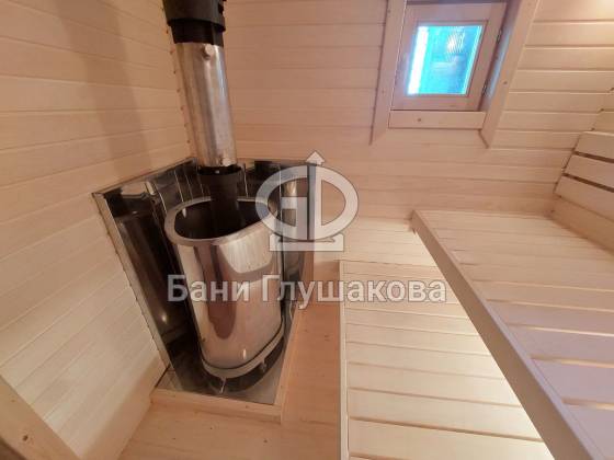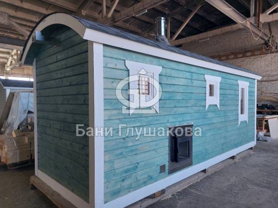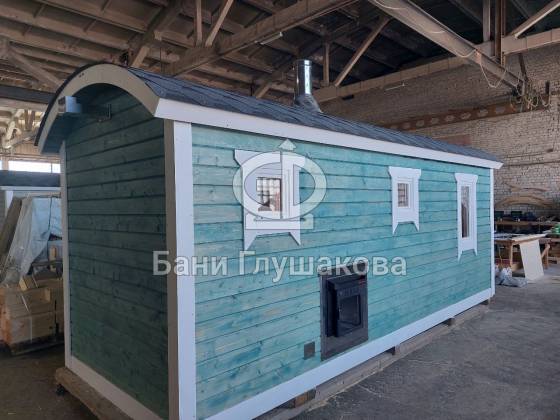 Это перевозная баня «Буханочка» в стандартном размере 2,2х6 метров. Собрана в «ласточкин хвост». Планировка слегка изменена по просьбе Заказчика. Он покупает уже вторую баню, поэтому тут сделано всё индивидуально. Топка печи вынесена на улицу. Печь куплена подороже и покруче — Ферингер. Утеплённый металлический экран сделан конкретно под эту модель.