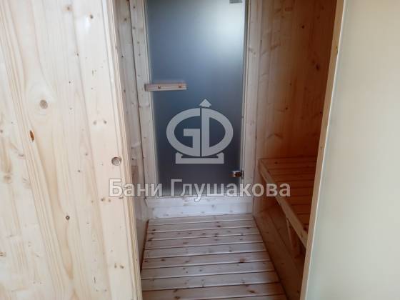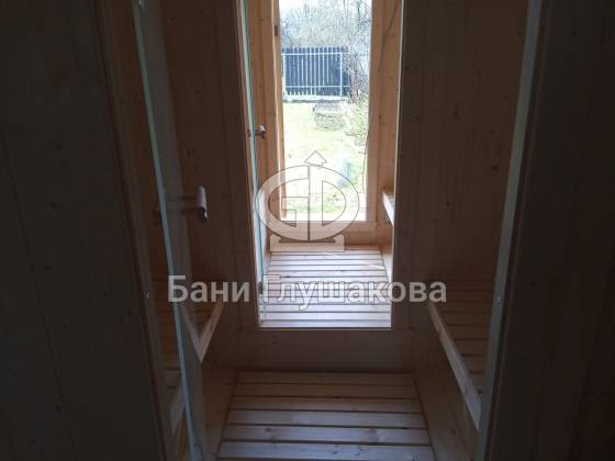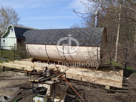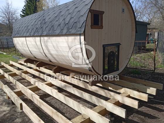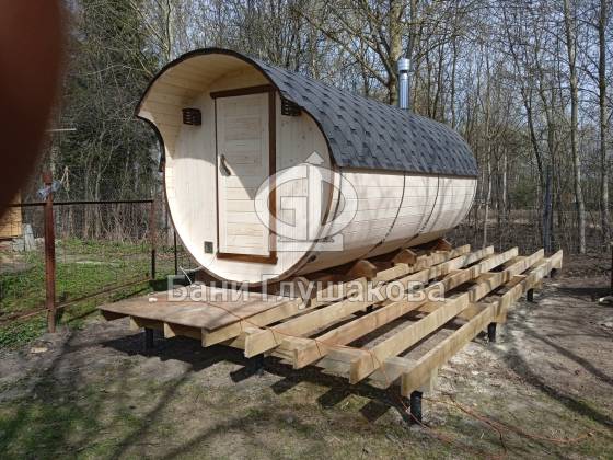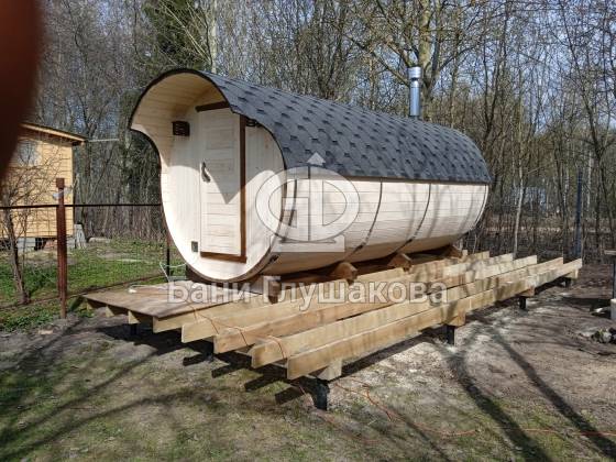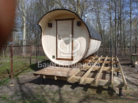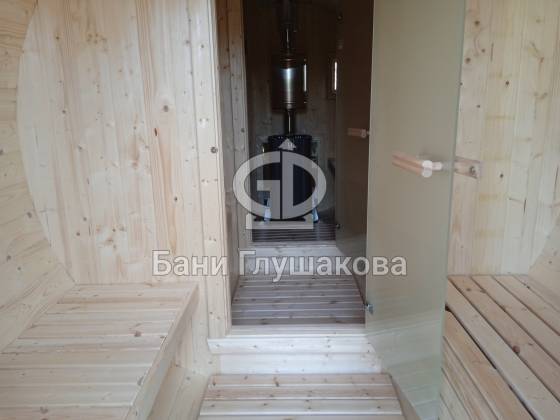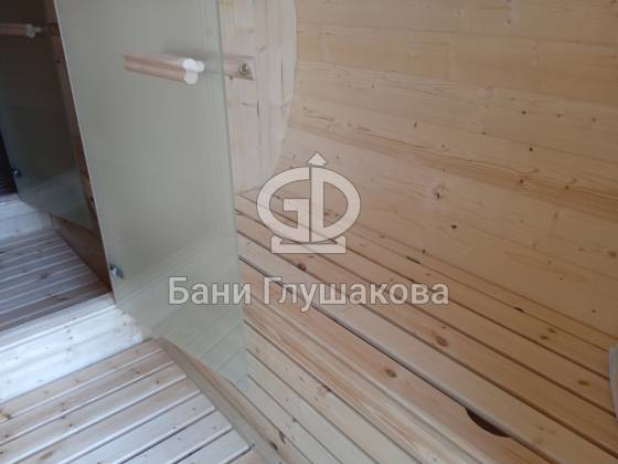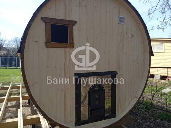 Пятиметровая баня бочка на 3 отделения — есть отдельная помывочная. Для сохранения чистоты в парной топку печи вынесли на улицу, установили специальный утеплённый экран.