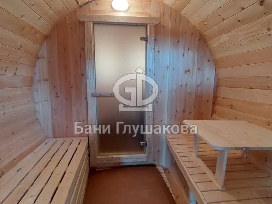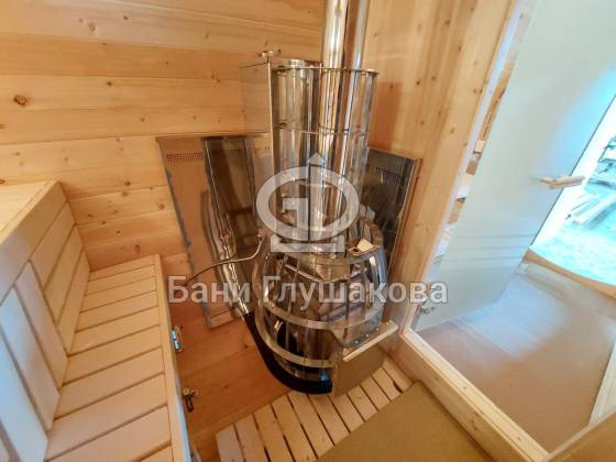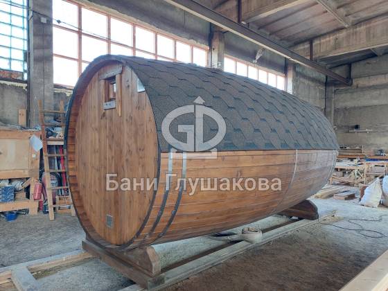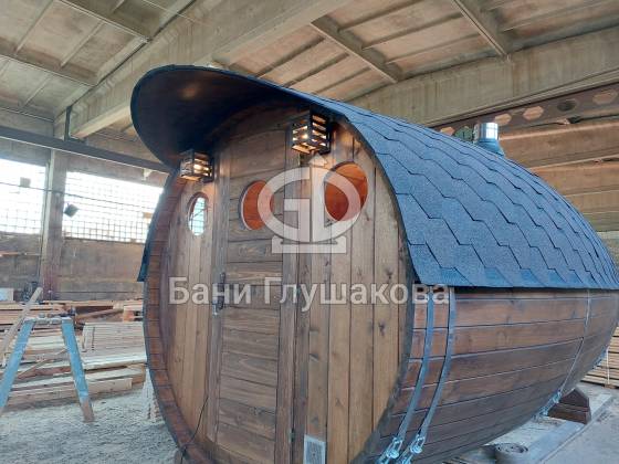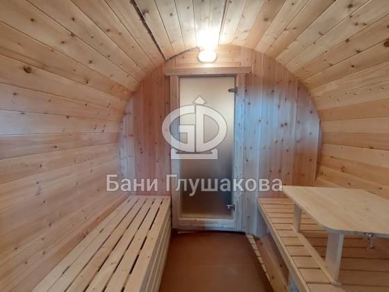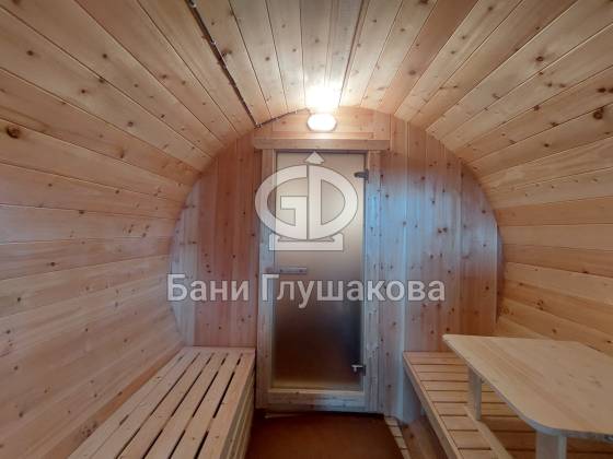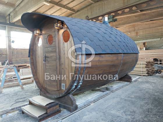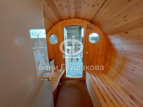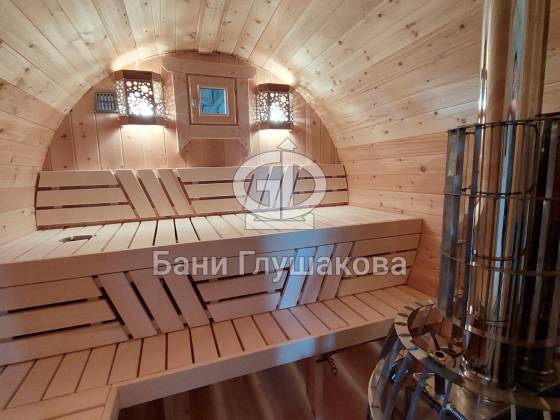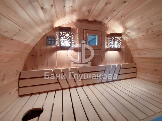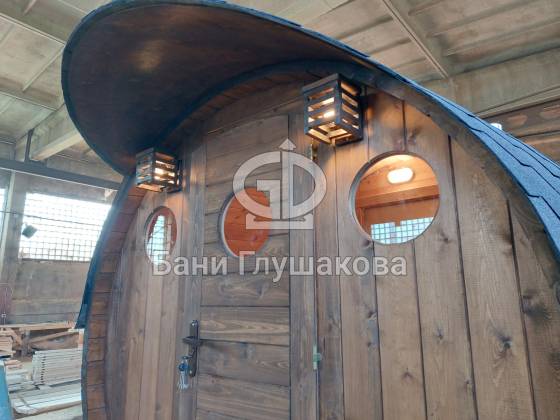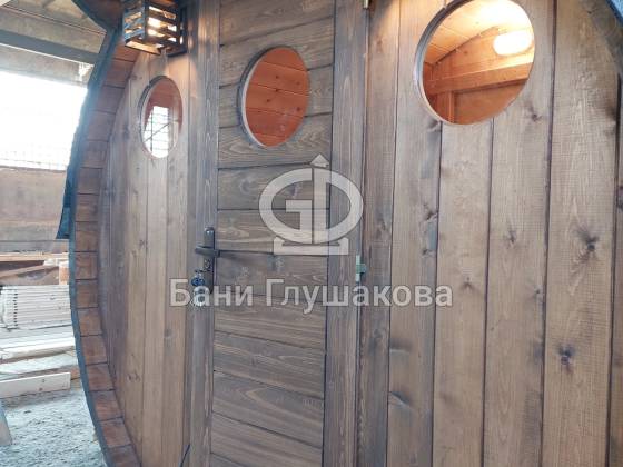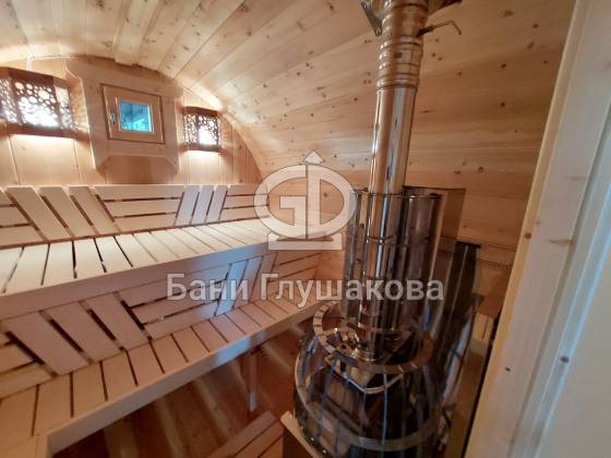 Проект «Ступино» длиной 4 метра — и именно на этой длине красивее всего смотрится объём. Баня действительно очень похожа на старинную винную бочку. Видео и фото не передают реальный размах бани. В живую она выглядит очень круто! Тот случай, когда глаз не оторвать.