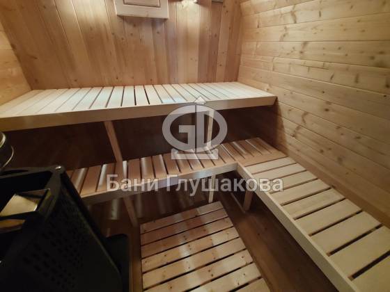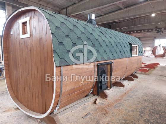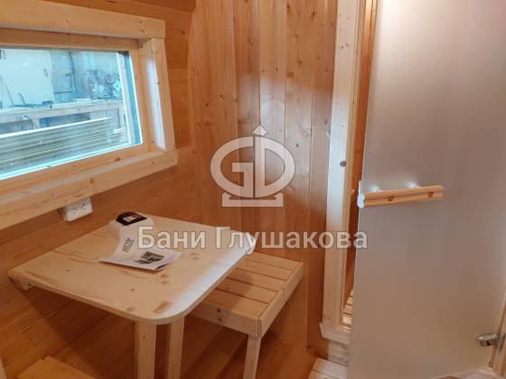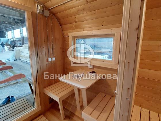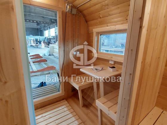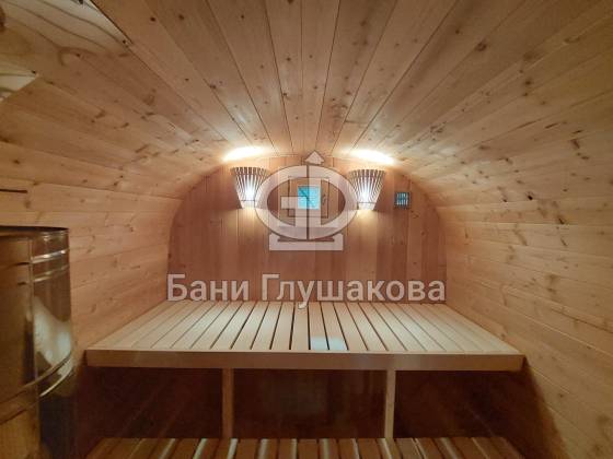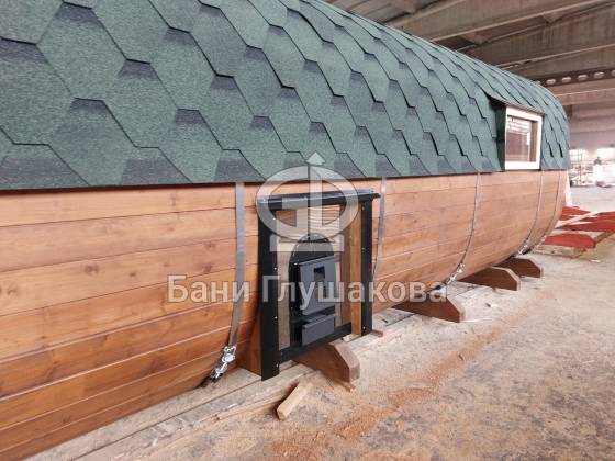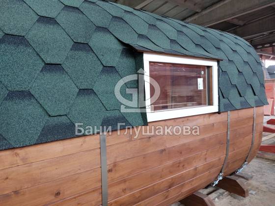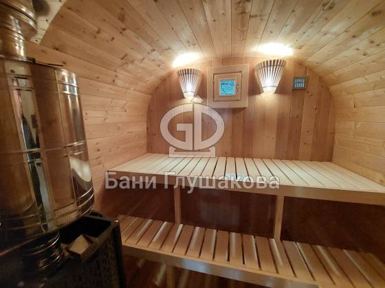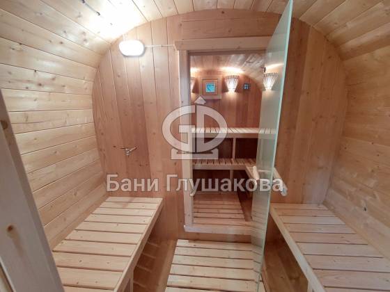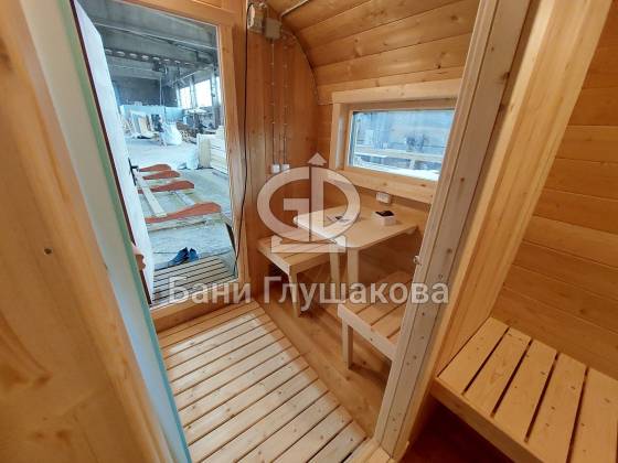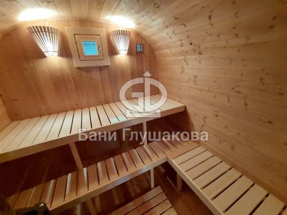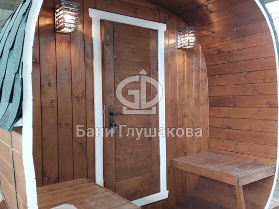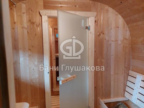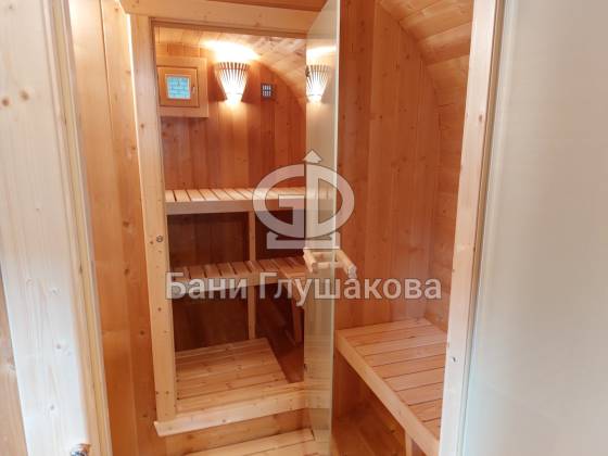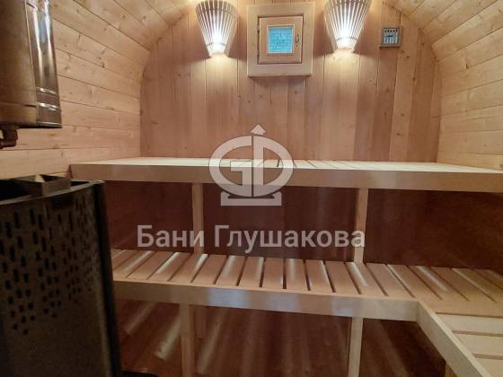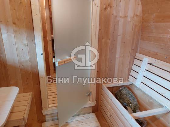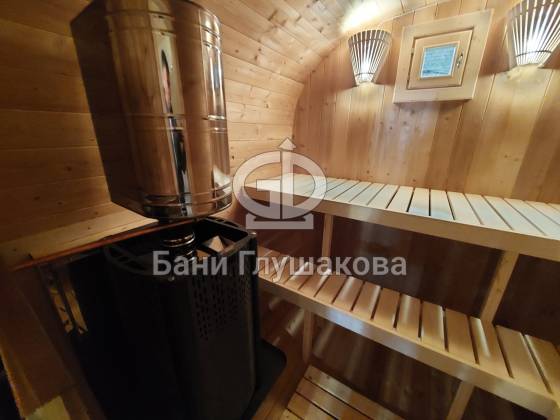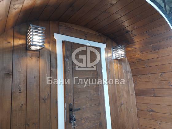 Главное достоинство, конечно, сборка из термодоски. Хотим подчеркнуть, что этот материал действительно стоит своих денег. При термировании волокна древесины буквально спаиваются, вся жидкость испаряется и получается что-то очень похожее на пластик. Термодоска не набирает и не отдаёт воду, не гниёт и не трескается. Для бань-бочек это без преувеличения идеальный материал.