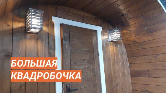 На обзоре интересная квадробочка из термодоски: размер 5,7 на 2,3 метра и на 3 отсека. Оснащена террасой и выносной топкой на улицу. Сбоку сделано окошко.