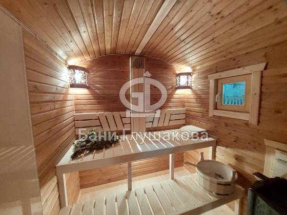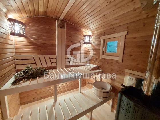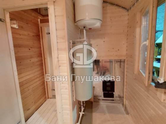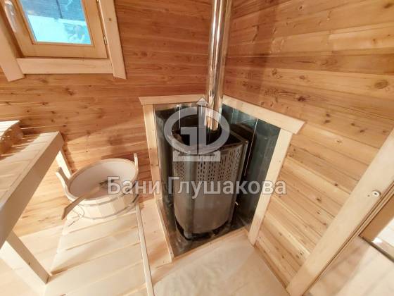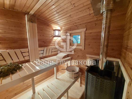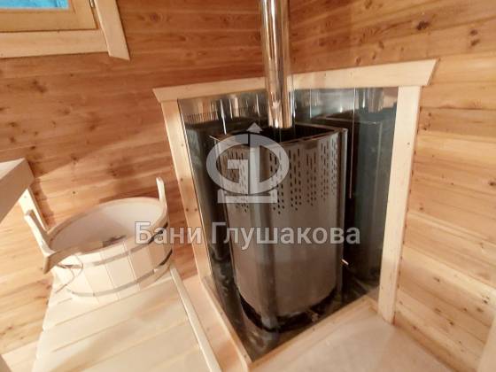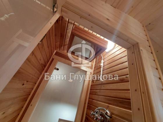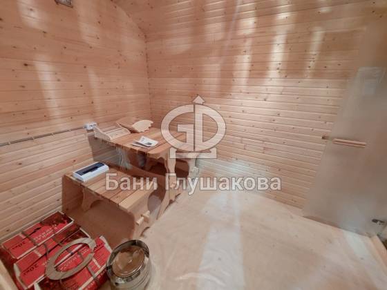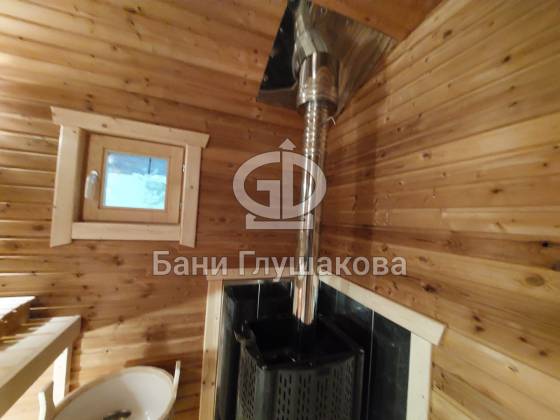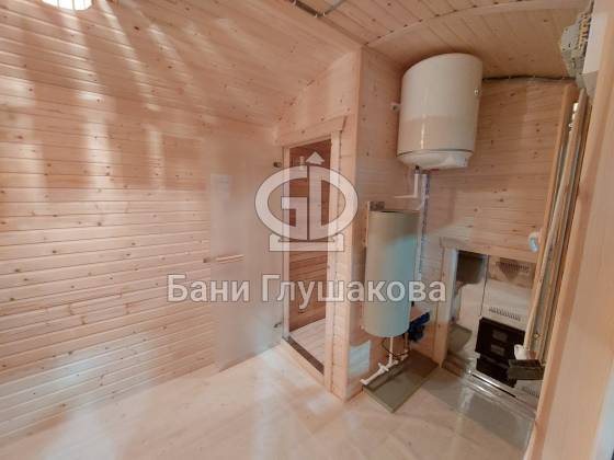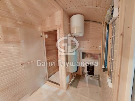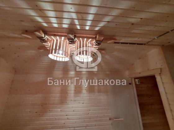 Баня в очень хорошей комплектации: вобрала в себя всё самое лучшее, на что мы способны. Тут и душевая система, и обливное устройство, и принудительная вентиляция «димасту», и душевая из термодоски. Также можно упомянуть разные маленькие улучшалки: металлические пороги под наклоном, печной экран из нержавейки, металлические светильники и пр.