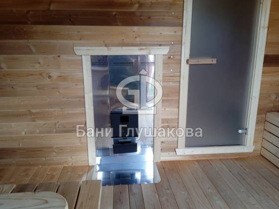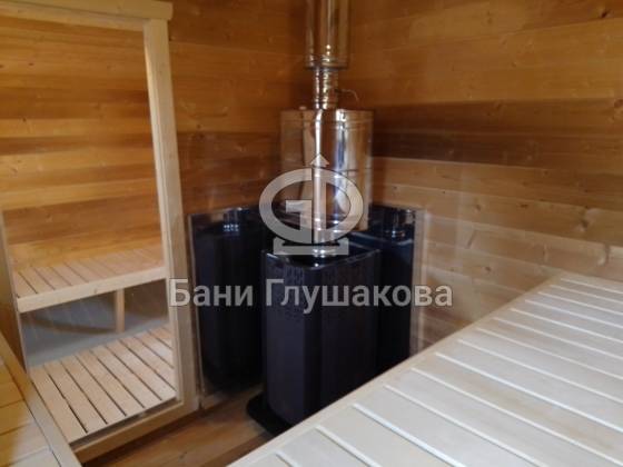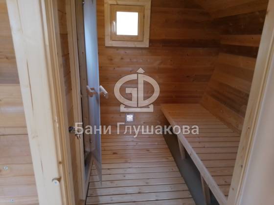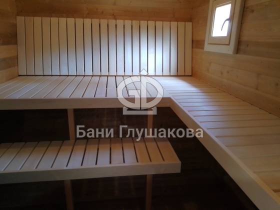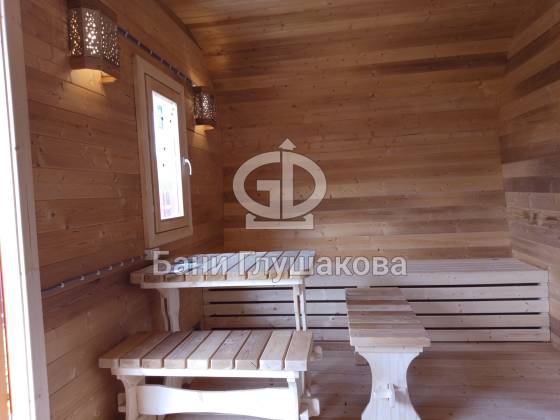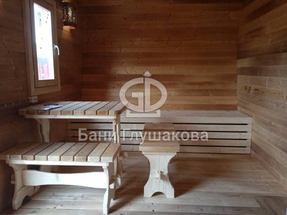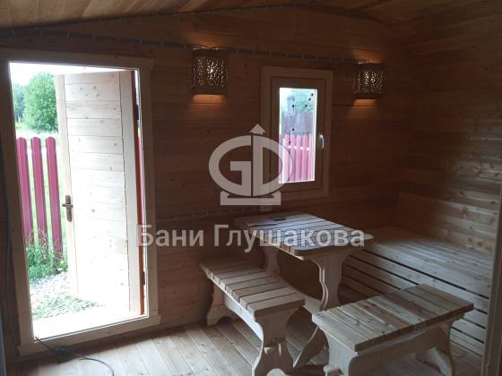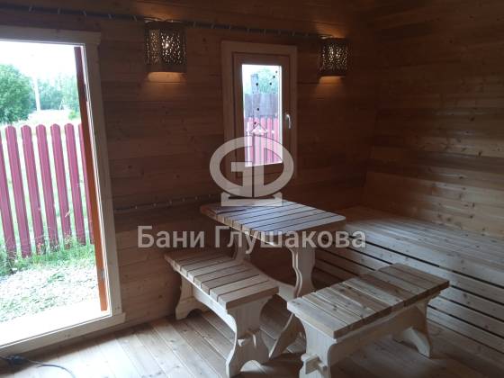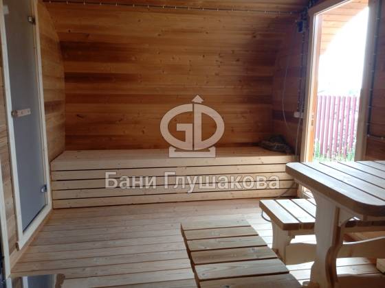 Термодоска для бани такого размера — это крайне желательная опция. Потому что из-за довольно большой площади пола другой материал (например, обычная еловая бочковая доска) может вести себя капризно — с большой долей вероятности в засушливый сезон появятся щели и скрип. В этой же бане таких проблем не будет.