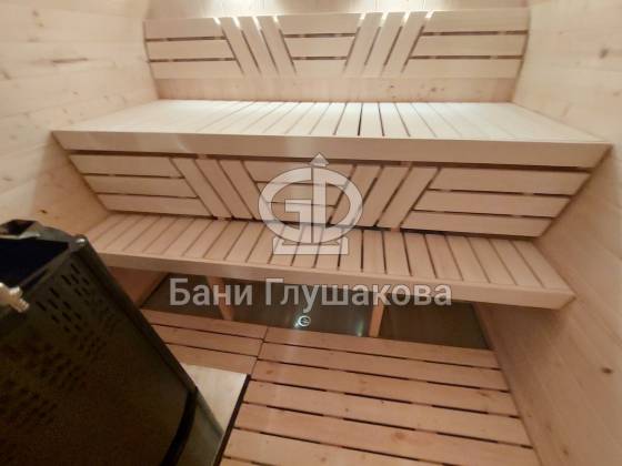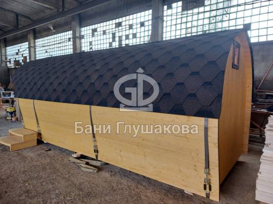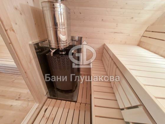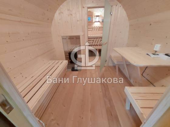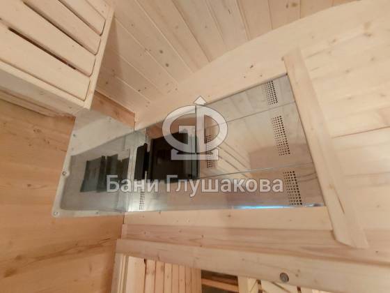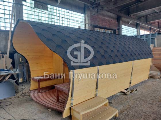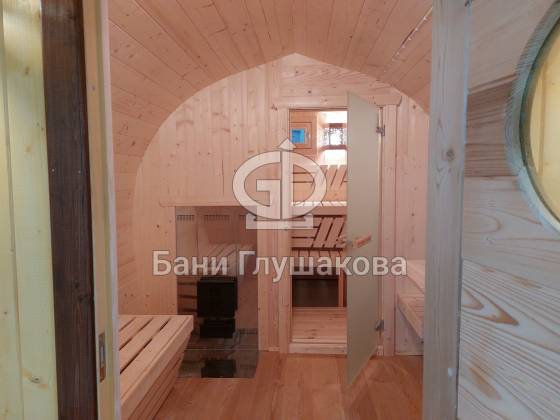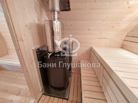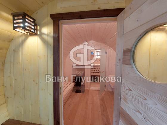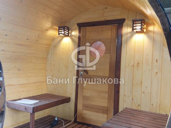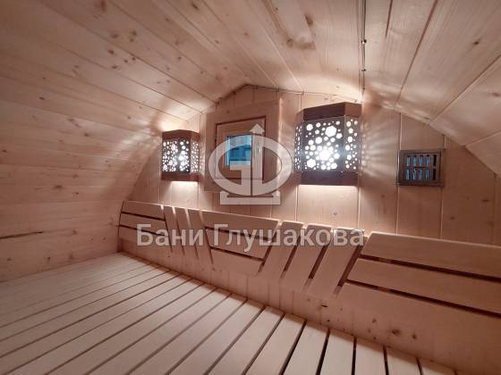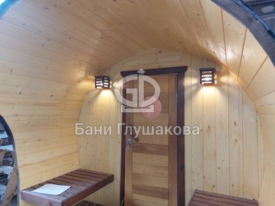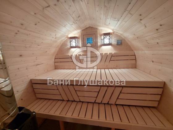Наша авторская разработка – баня-бочка куполообразной формы «София». Этот образец наполнен всеми нашими последними ништяками – металлическими абажурами, нержавеющим экраном вокруг печи, улучшенной вентиляцией.