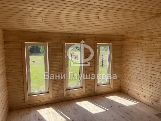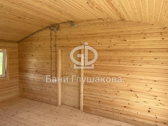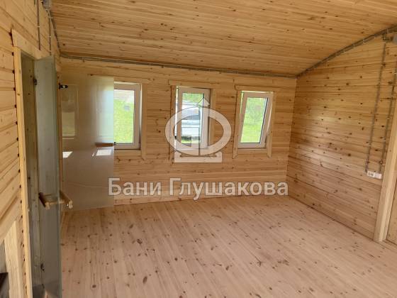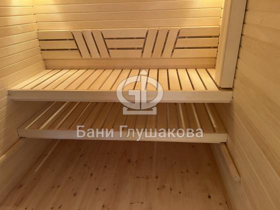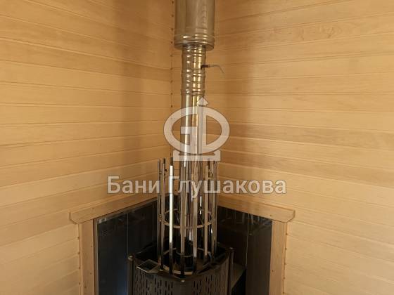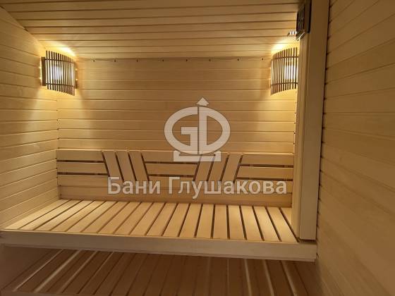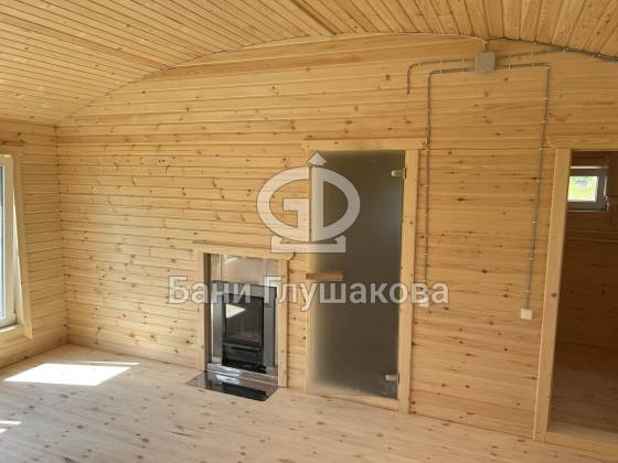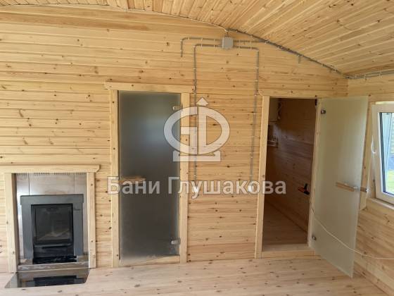 Отличительная особенность линейки «Бурже» — галерея высоких окон. Конкретно в этой бане в комнате отдыха по обе стороны по три окна — тут очень светло! А выносная топка печи создаёт эффект камина. Если добавить сводчатый потолок, то ощущаешь себя будто в гостиной старинного замка.