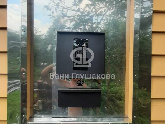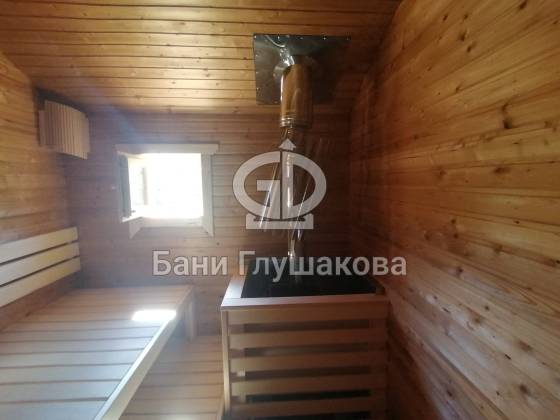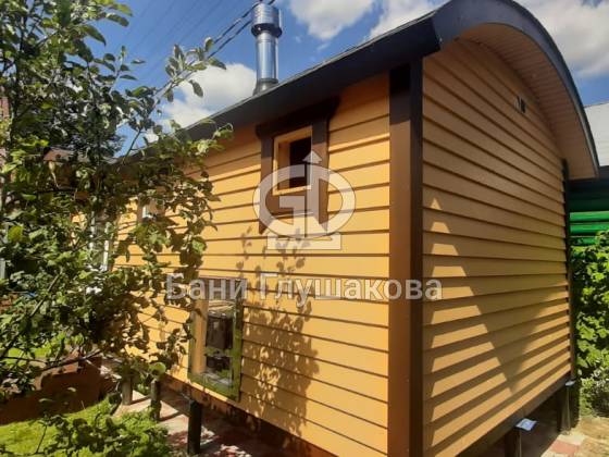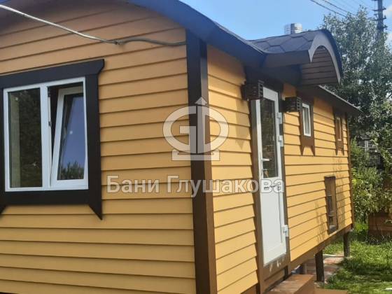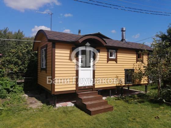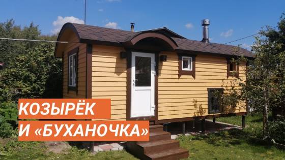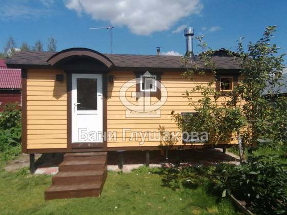 Ещё один замечательный образец перевозной бани «Буханочка» каркасной сборки. Здесь в качестве дополнительных опций сделаны козырёк над входной дверью и выносная топка на улицу. Кстати, некоторые из наших клиентов говорят, что следующую баню закажут именно с возможностью топить с улицы — так чище и не съедается место внутри бани.