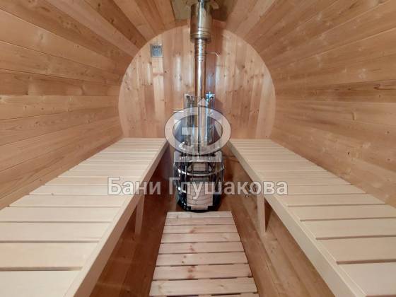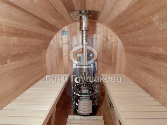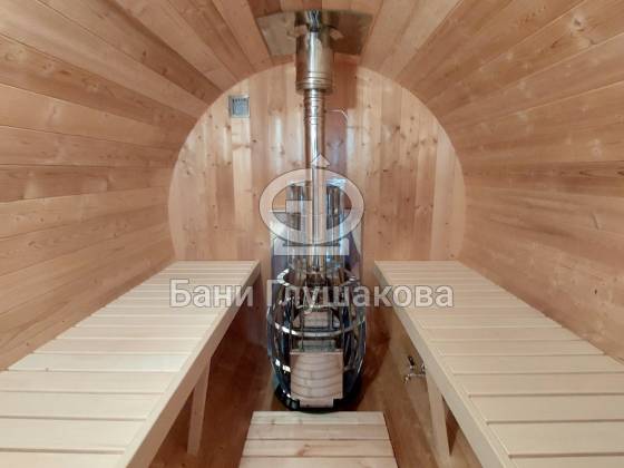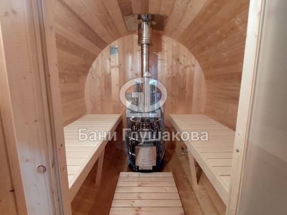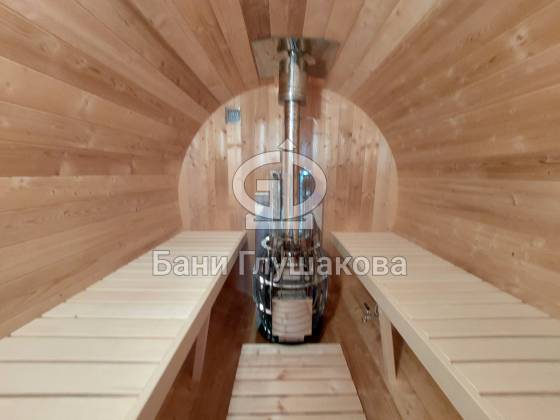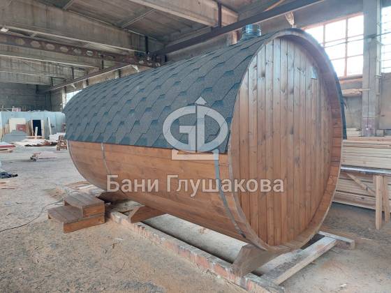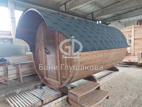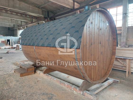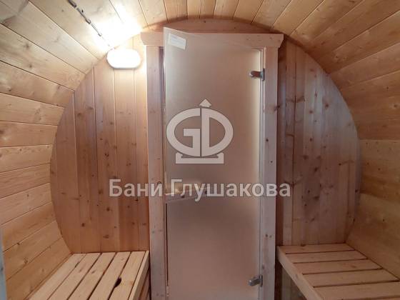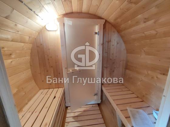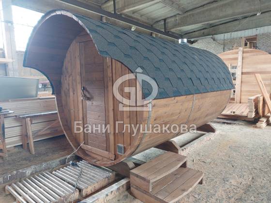 Одна из самых маленьких бань, которую можно заказать у нас - круглая баня бочка размером 2,1 на 3,5 метра. Такая малютка, изготовленная из термодоски, будет служить своим хозяевам долгие десятилетия.
