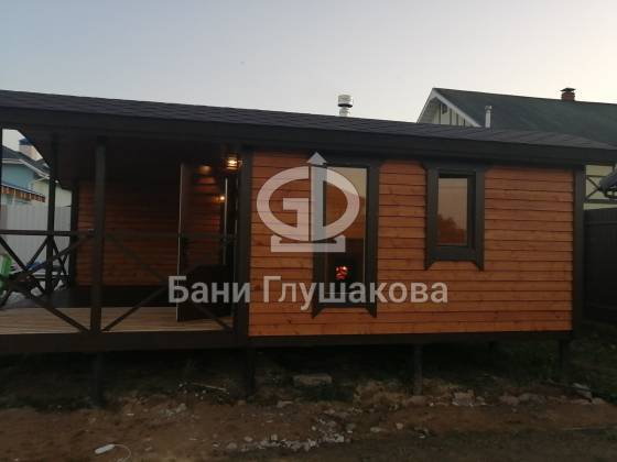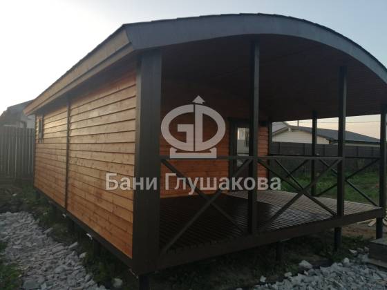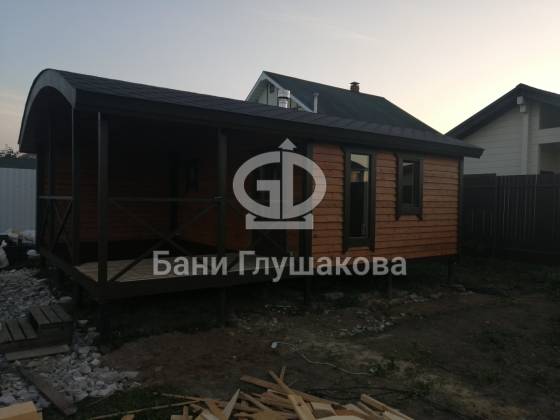 Стильная баня «Бурже» в сдержанных темных тонах сдана! Основная изюминка проекта – большая крытая терраса. Места хватит поставить диванчик. плетеные кресла и столик.