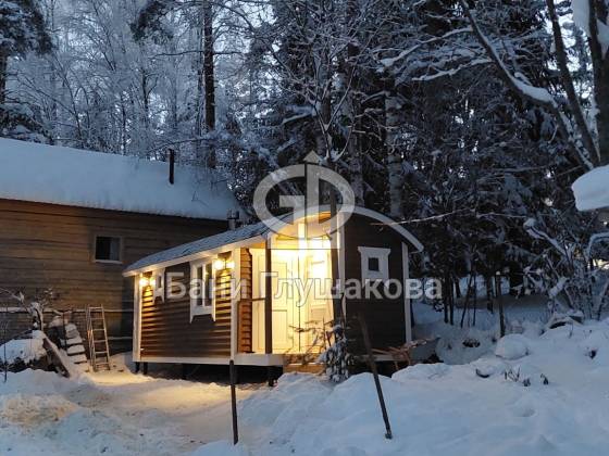 Отдельного восхищения заслуживает ну очень удачное уличное освещение – из-за тёплой подсветки в заснеженном лесу эта банька выглядит как пряничный домик.