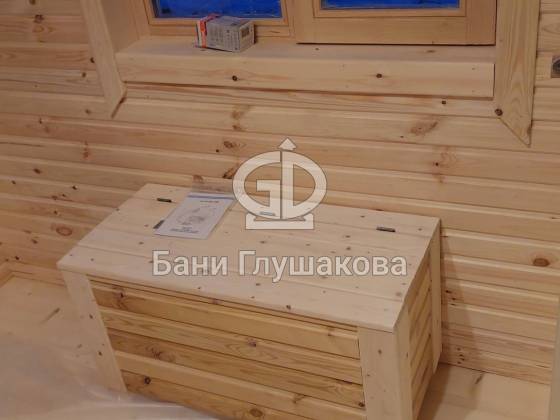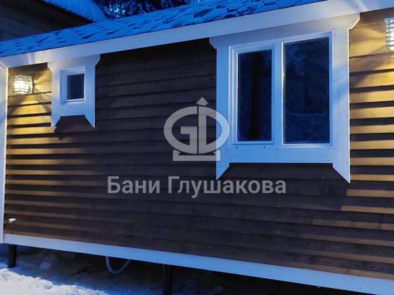 Размер бани 3 на 7 метров. Из особенностей – пристроен хозблок с отдельным входом и с другой стороны дровяничок. А на входе в баню получилось небольшое крытое крылечко.