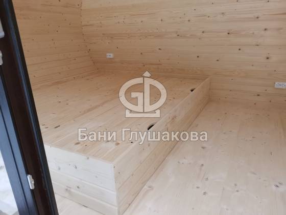 Домик 3 на 6 метров с трёхметровой террасой. Тут всего 2 помещения: спальня со встроенной кроватью-подиумом и санузел.