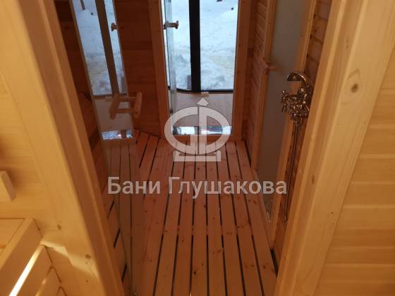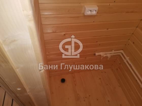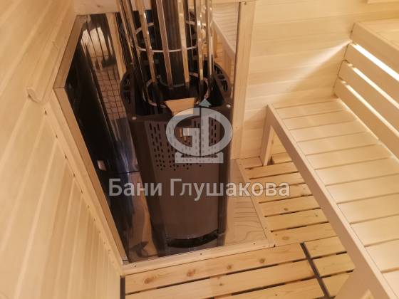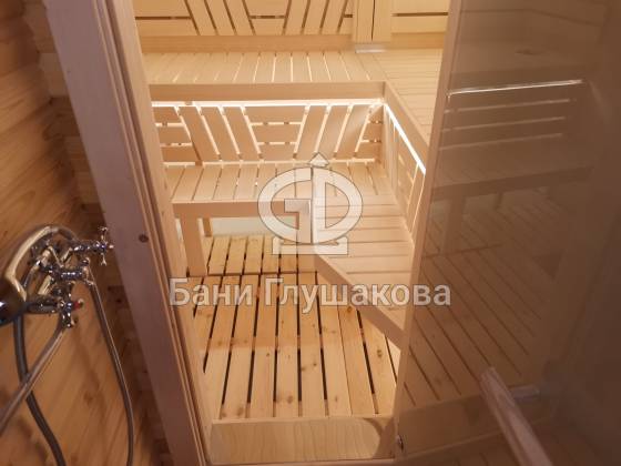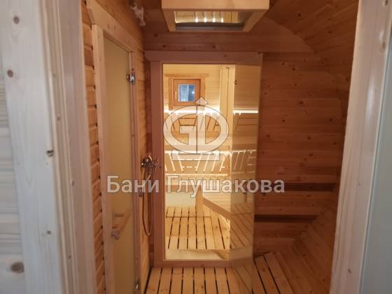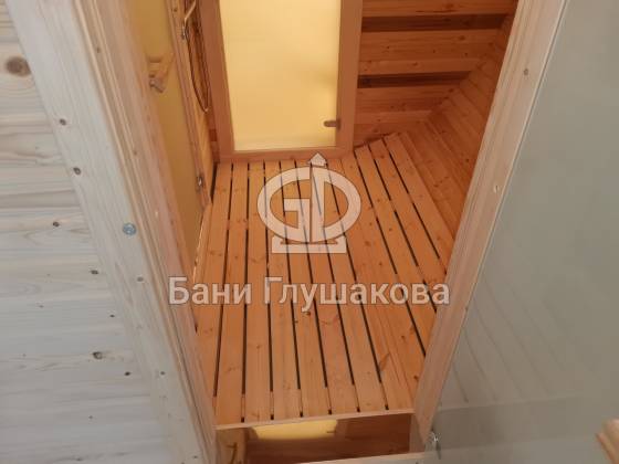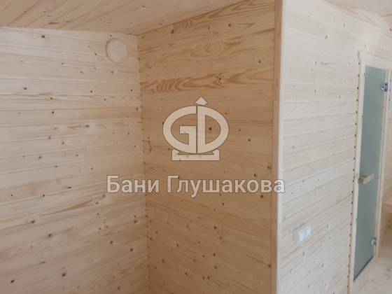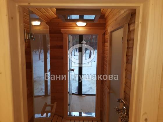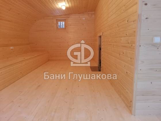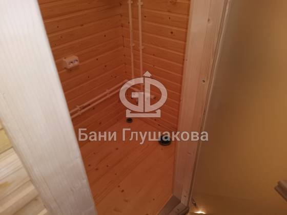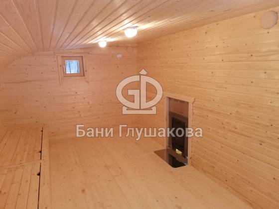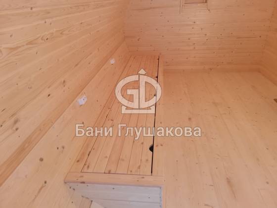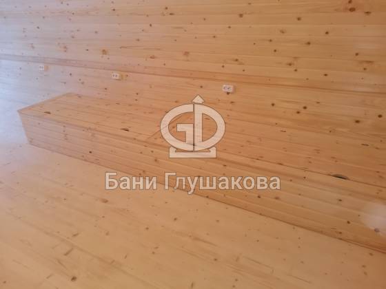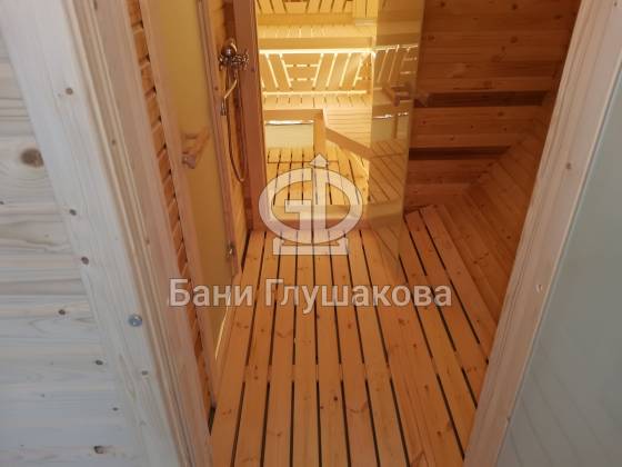 Баня размером 6 на 6 метров. Есть комната отдыха, душевое помещение, сауна и санузел.