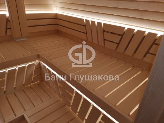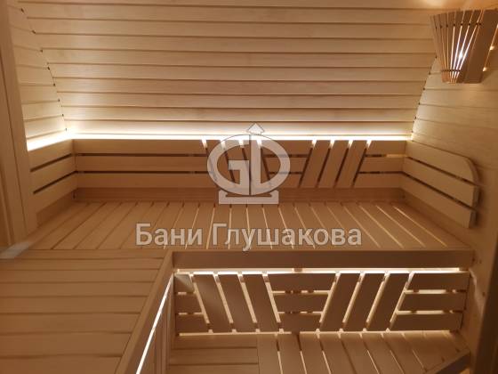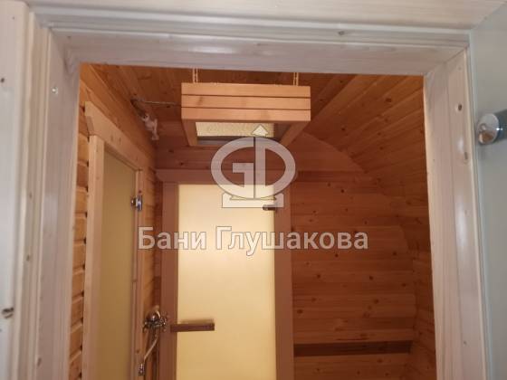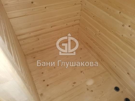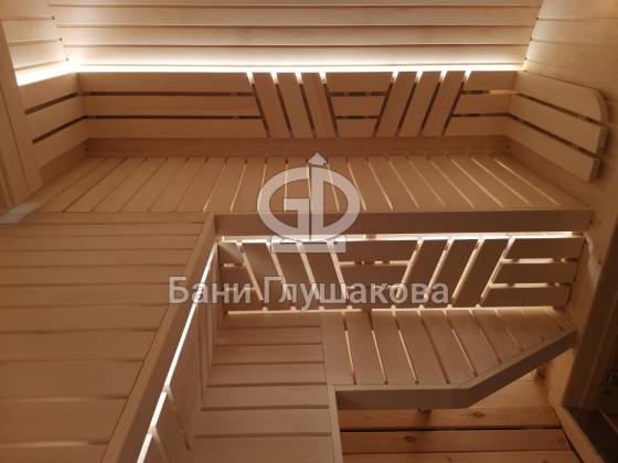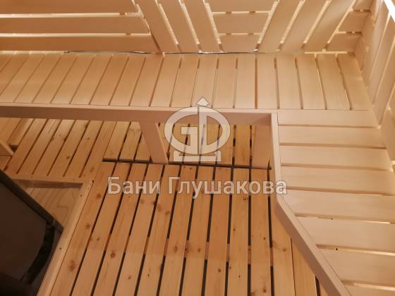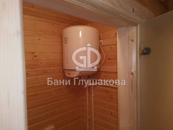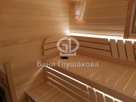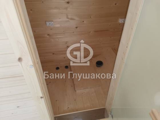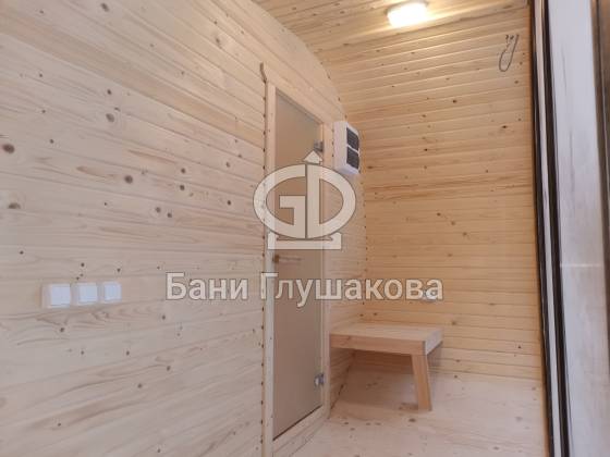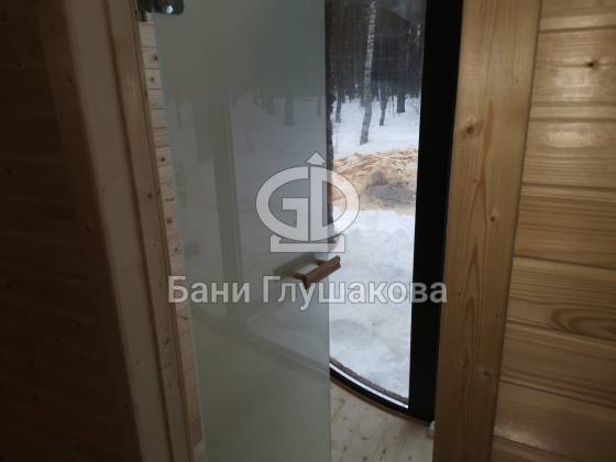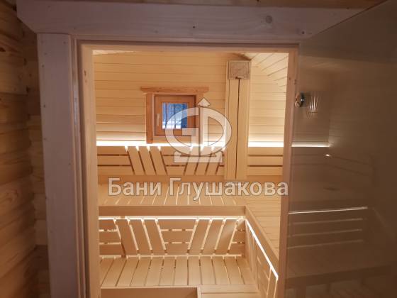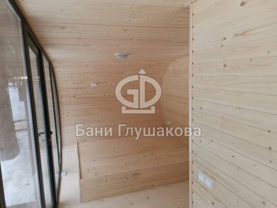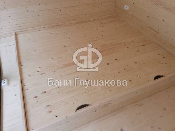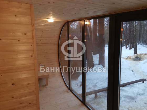 Баня размером 6 на 6 метров. Есть комната отдыха, душевое помещение, сауна и санузел.