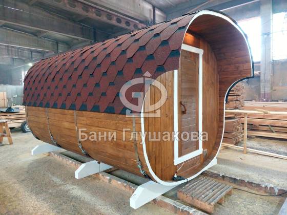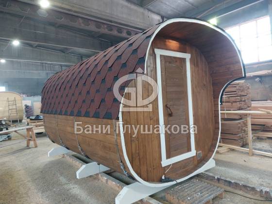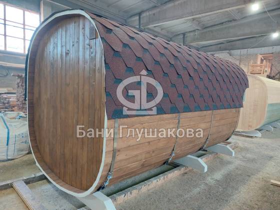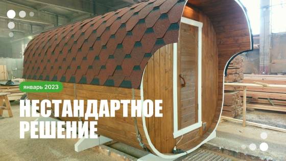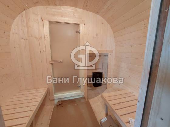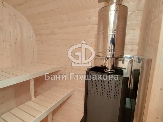 В банях такого типа выносную топку делали впервые. Это возможно только в банях увеличенного диаметра – у этой, например, ширина 2,4 метра (а длина всего 4 метра).