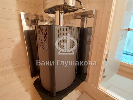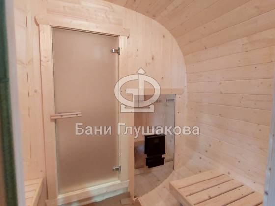 Вроде бы совершенно обычная квадратная баня бочка, но есть в ней одна интересная особенность. Заказчик попросил установить печь так, чтобы можно было топить из комнаты отдыха.