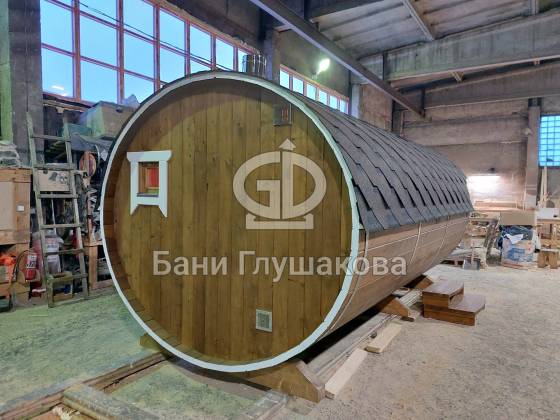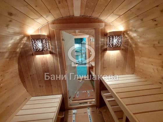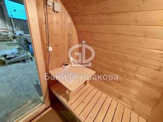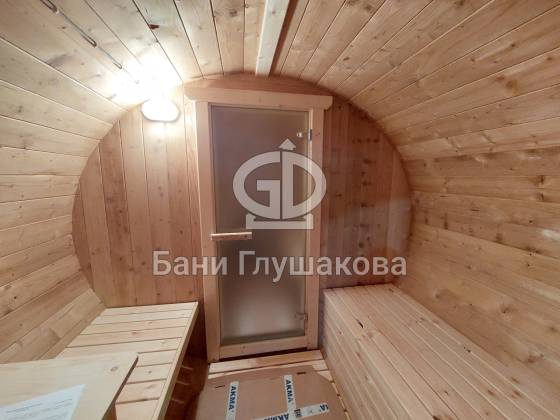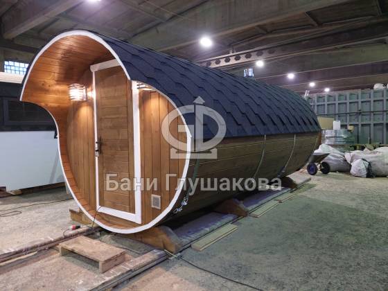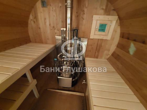 Эх, редко стали строить овальные бани бочки – их вытеснили разные другие модели. Поэтому так радостно примерить на эту баньку наши последние улучшения: сборку из термомодифицированной доски, печь нашего производства с парогенератором, металлический экран за печью, металлические светильники и т. п.