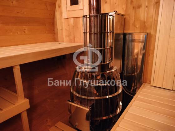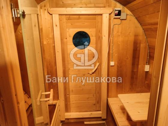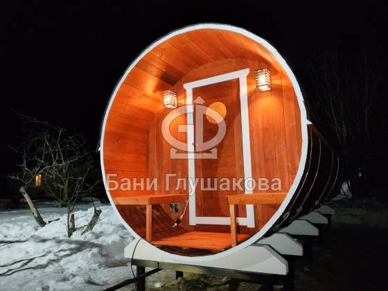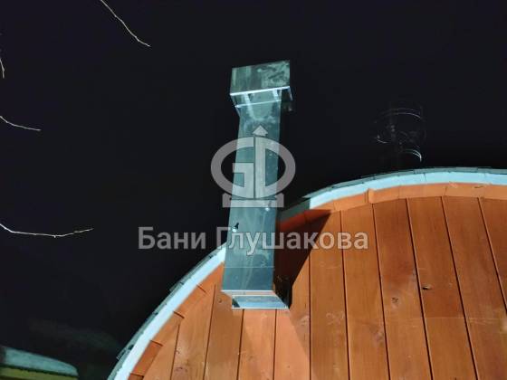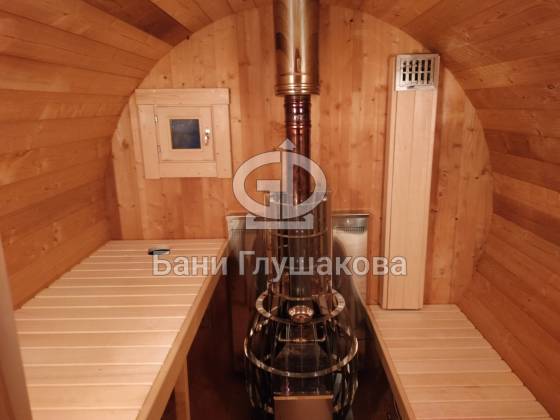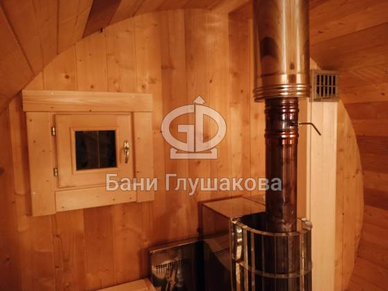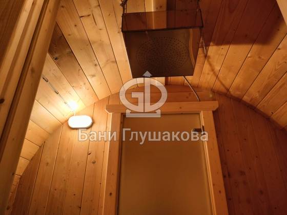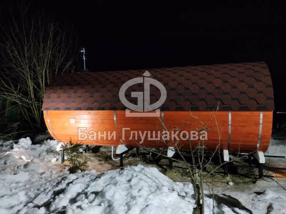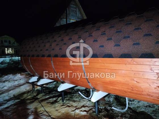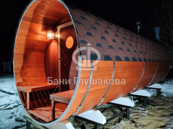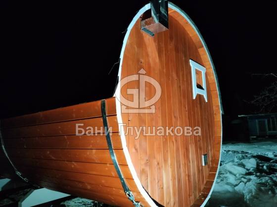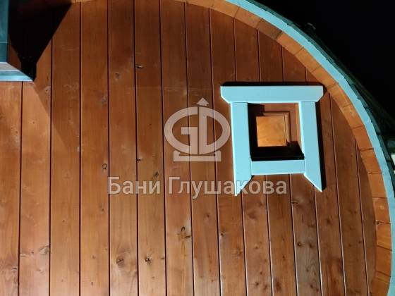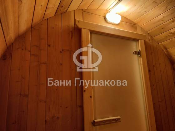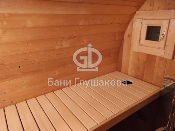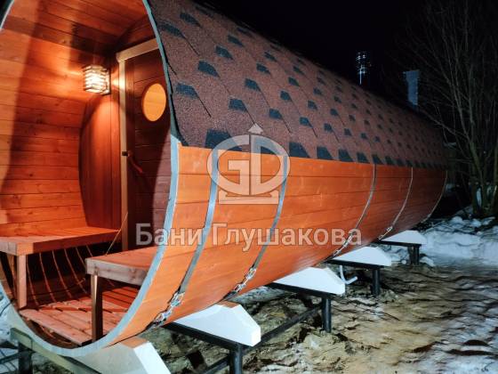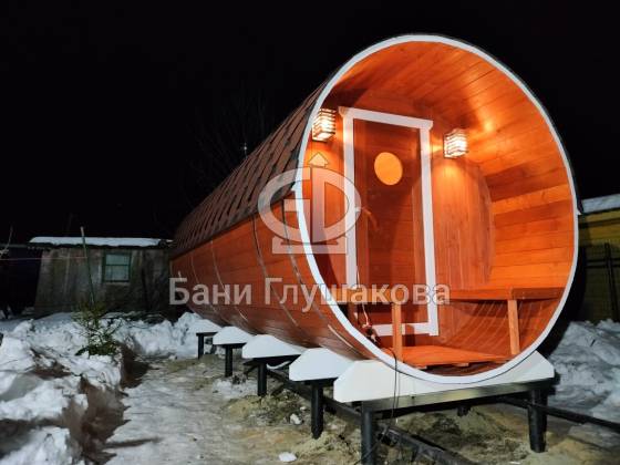 Нестандартный вариант круглой бани увеличенного диаметра: размер 2,3 метра в ширину, 5,7 метров в длину. Баня изготовлена из термодревесины.