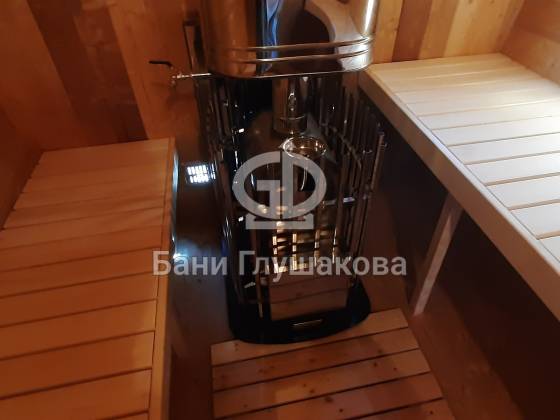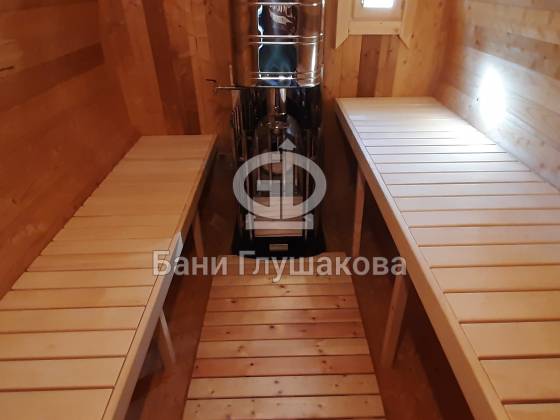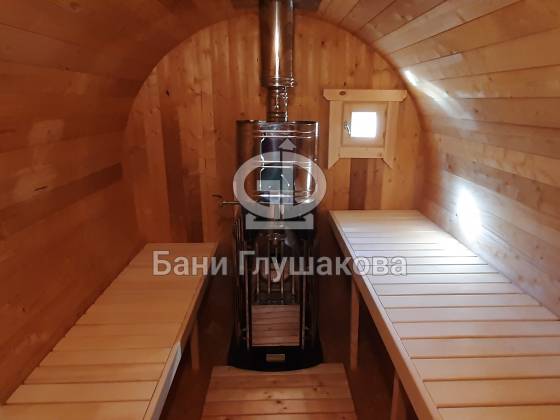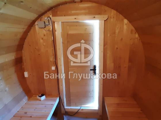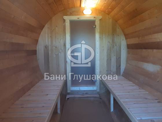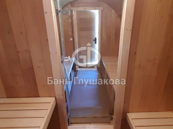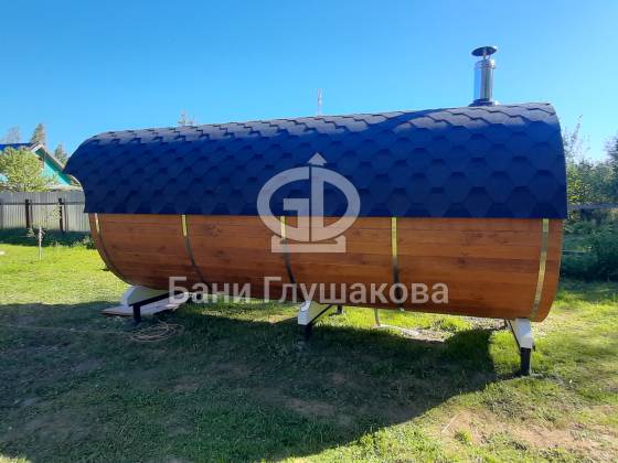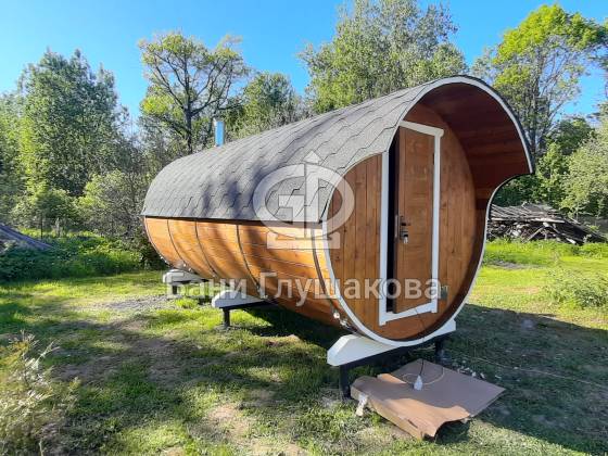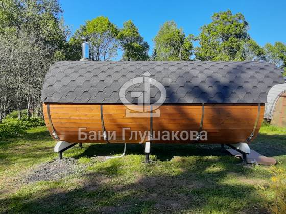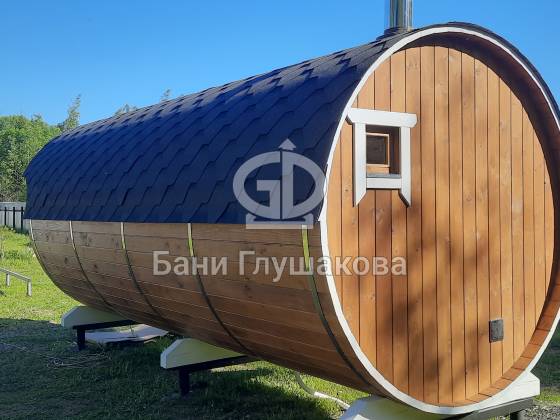 Классическая круглая баня бочка длиной 5 метров из термодоски. На два отделения. Покрашена в такой милый моему сердцу оттенок «Орех» с белой обводкой.