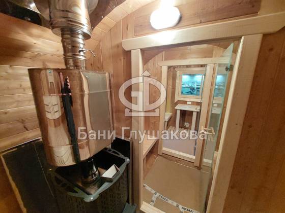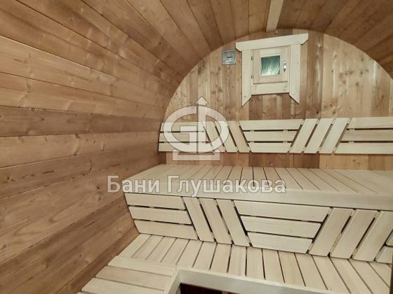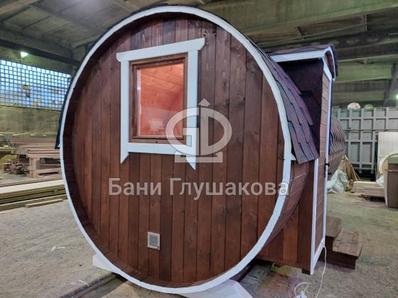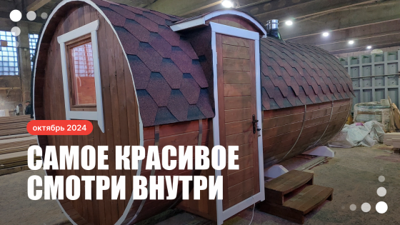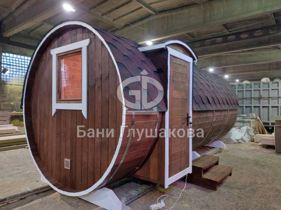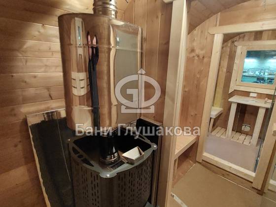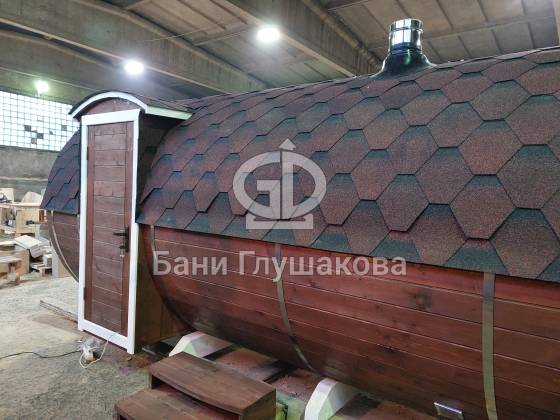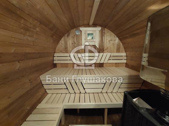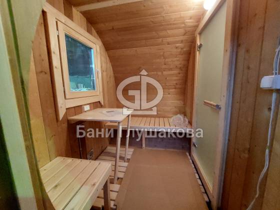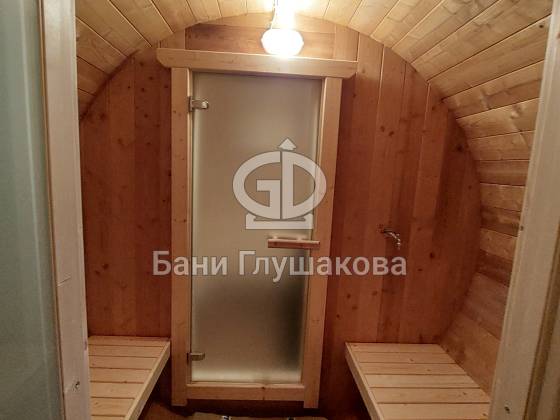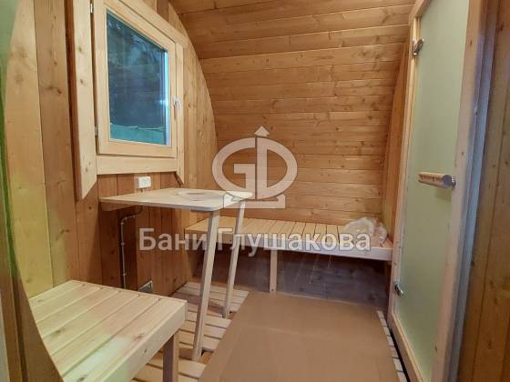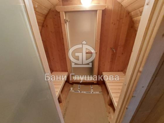 Баня круглой формы с боковым входом. Изготовлена из термодревесины. 2,3 в диаметре и 5 метров в длину. Заходим в комнату отдыха – 1,5 метра, душевая – 1,1 метр, парная – 2 метра.