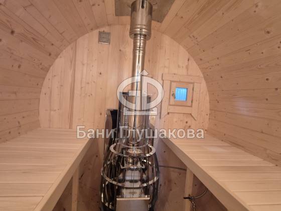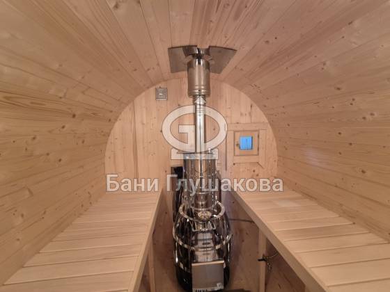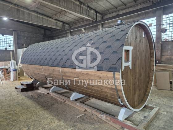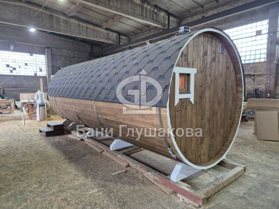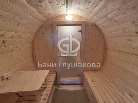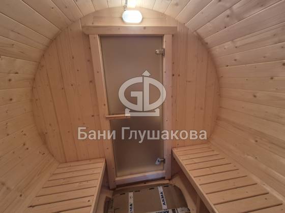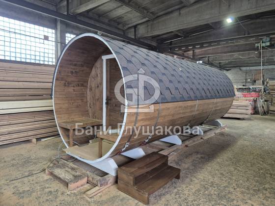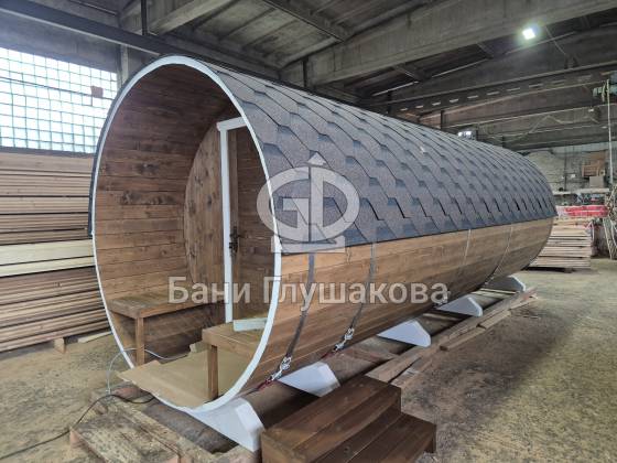Круглая баня-бочка с террасой 5,7 × 2,3 м – компактный, стильный и доступный вариант для дачи.