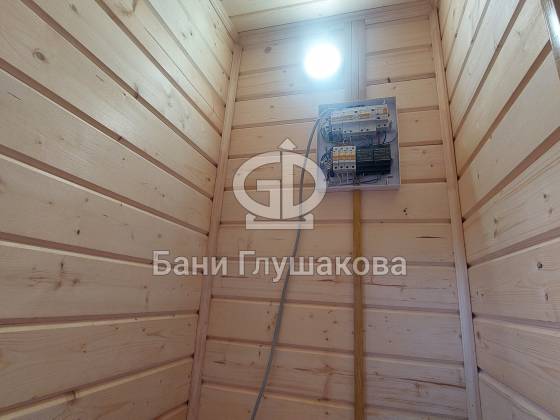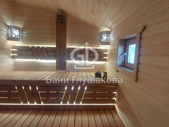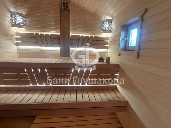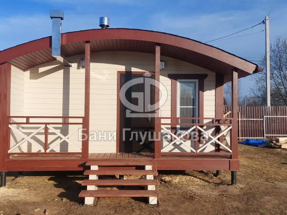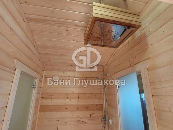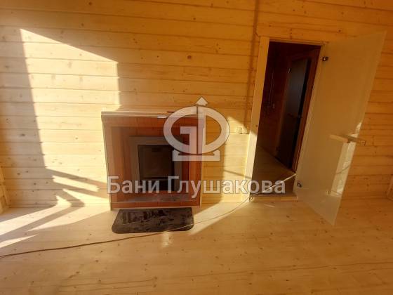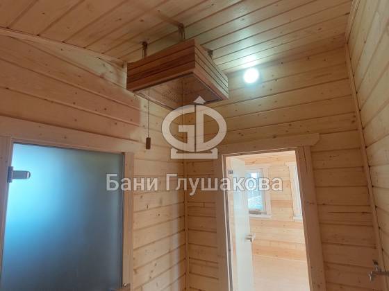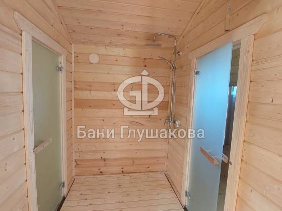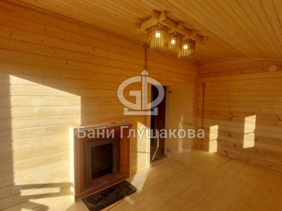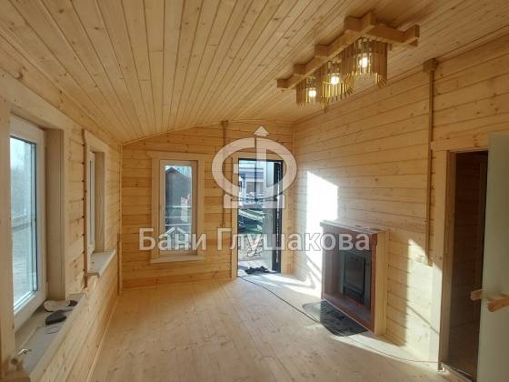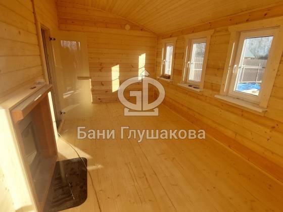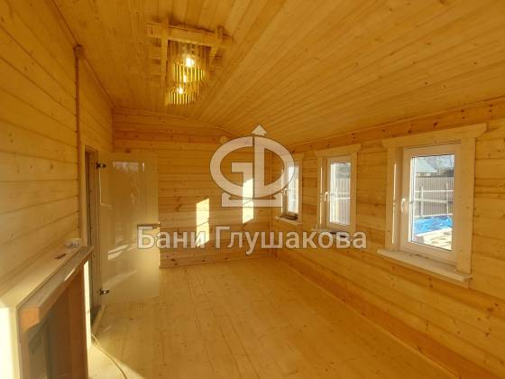 Баня из клееного бруса 6 × 5,3 м – светлая, просторная, уютная.