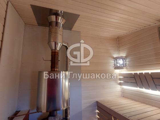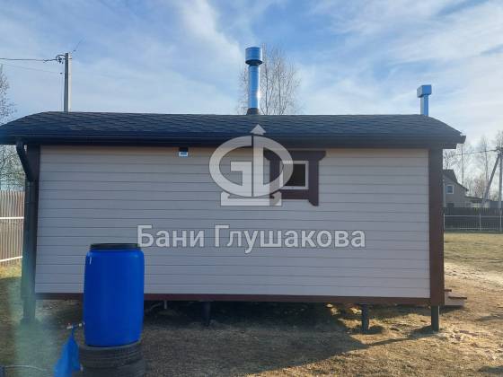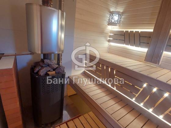 Внутри – просторная комната отдыха, где хватит места для всей компании, мойка с душем и обливным устройством для контрастных процедур, отдельная бойлерная и уютная парная для настоящего банного отдыха.